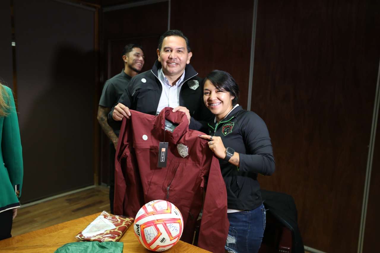 Durante la reunión, la jugadora Celeste Vidal entregó algunos “souvenirs” y un balón autografiado al alcalde, quien se tomó una fotografía con los jugadores y jugadoras representativas de los Bravos del FC Juárez.