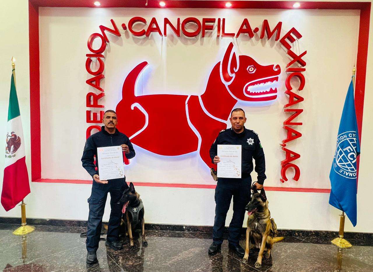 Ciudad Juárez.- Elementos caninos y sus manejadores pertenecientes a la división K9 de la Secretaría de Seguridad Pública Municipal, obtuvieron el reconocimiento en la justa denominada “Mejor perro del año en trabajo y servicio 2023” por parte de la Federación Canófila Mexicana.