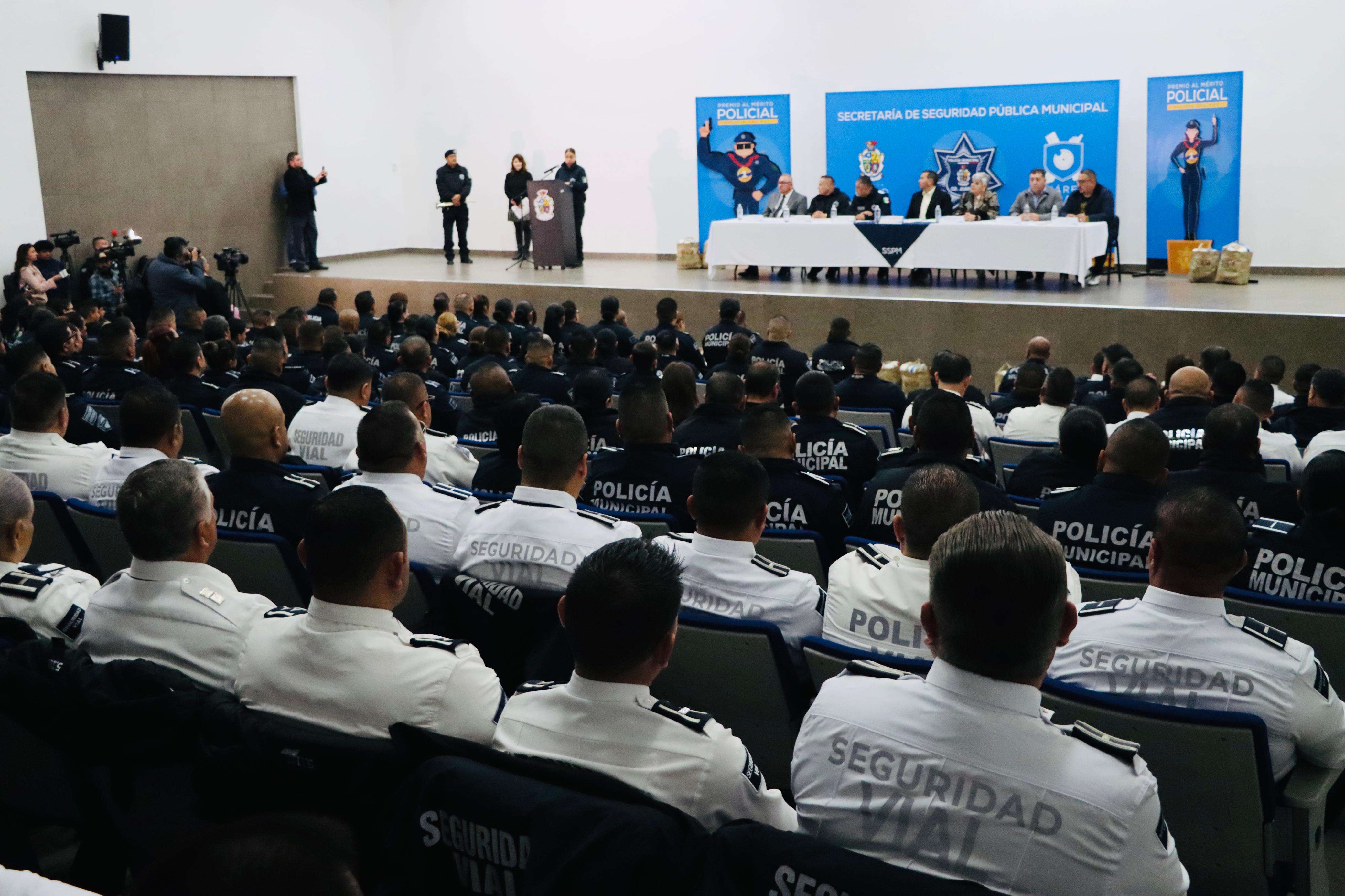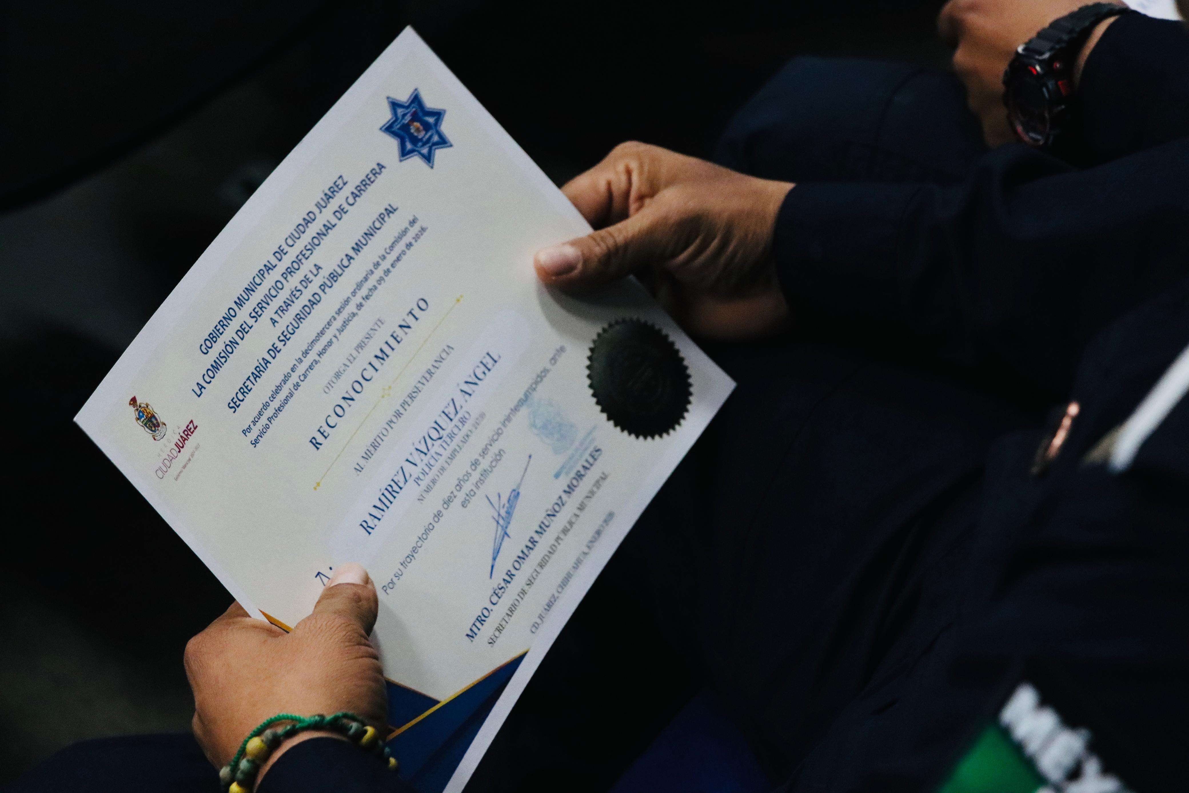 Ciudad Juárez -. La Secretaría de Seguridad Pública Municipal realizó la tradicional ceremonia de reconocimiento y entrega de estímulos a los policías destacados del mes de diciembre, así como al personal operativo por el mérito de perseverancia por sus años de servicio dentro de la corporación.
