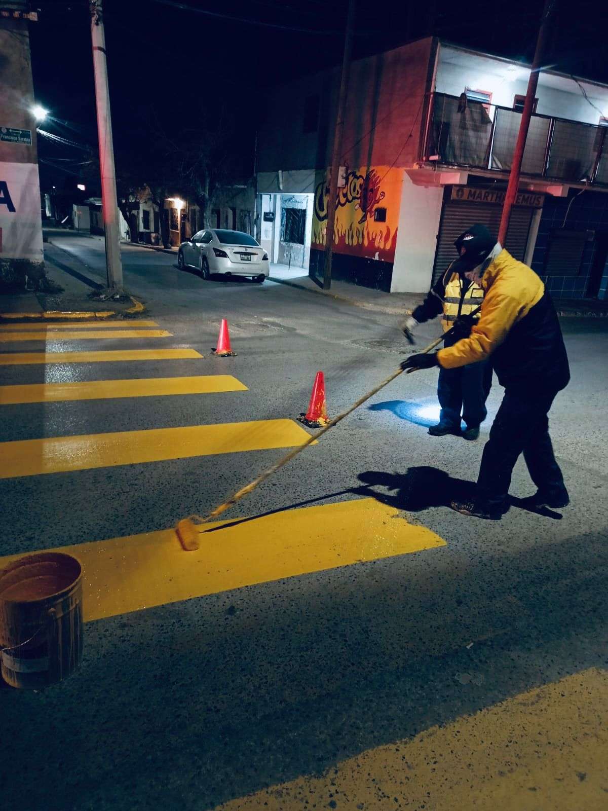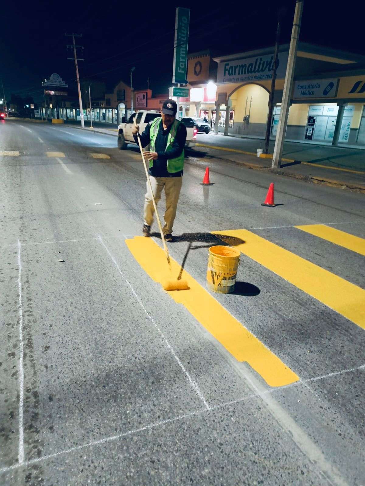 Trabajos nocturnos de pintura para delimitar cruces peatonales y cordones de banqueta en las calles Fernando Montes de Oca y Granate, frente al Jardín de Niños Club Sertoma, a fin de evitar afectaciones al tráfico durante el día.