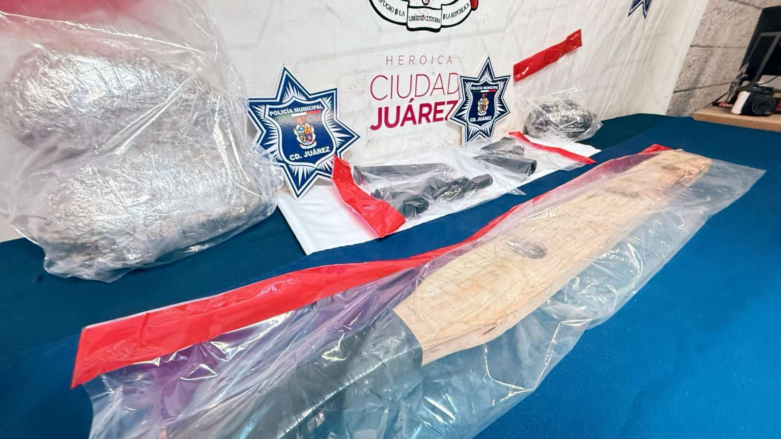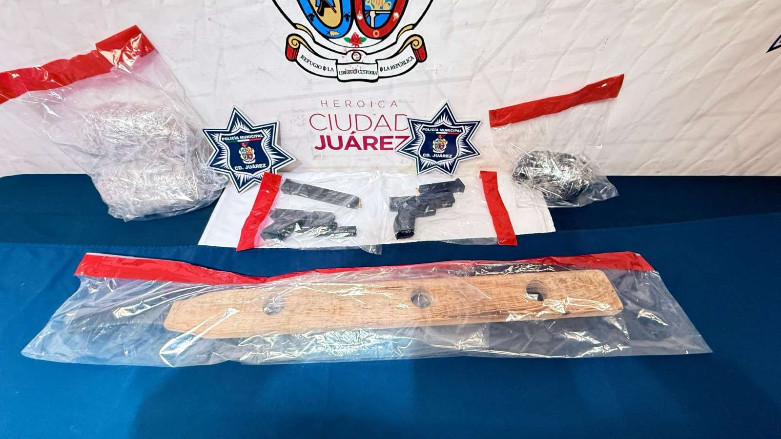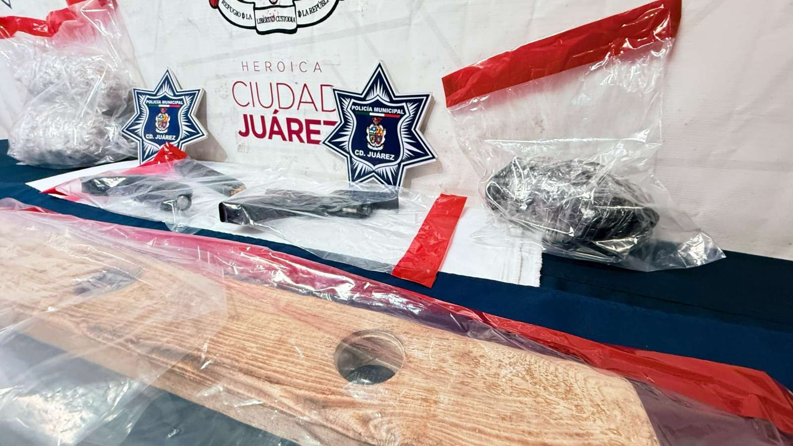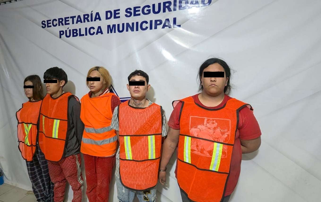 Ciudad Juárez.- Agentes de la Secretaría de Seguridad Pública Municipal adscritos en la Estación de Policía del Distrito Poniente capturaron a Edwin Jared L. C., Jaime Jovanny R. M., Vianney Michelle G. A., Ashley Nohemí S. M., Jennifer R. G y dos adolescentes, por su presunta responsabilidad en la comisión de delitos contra la ley federal de armas de fuego y explosivos, privación de la libertad, posesión de vehículos con reporte de robo y delitos contra la salud.