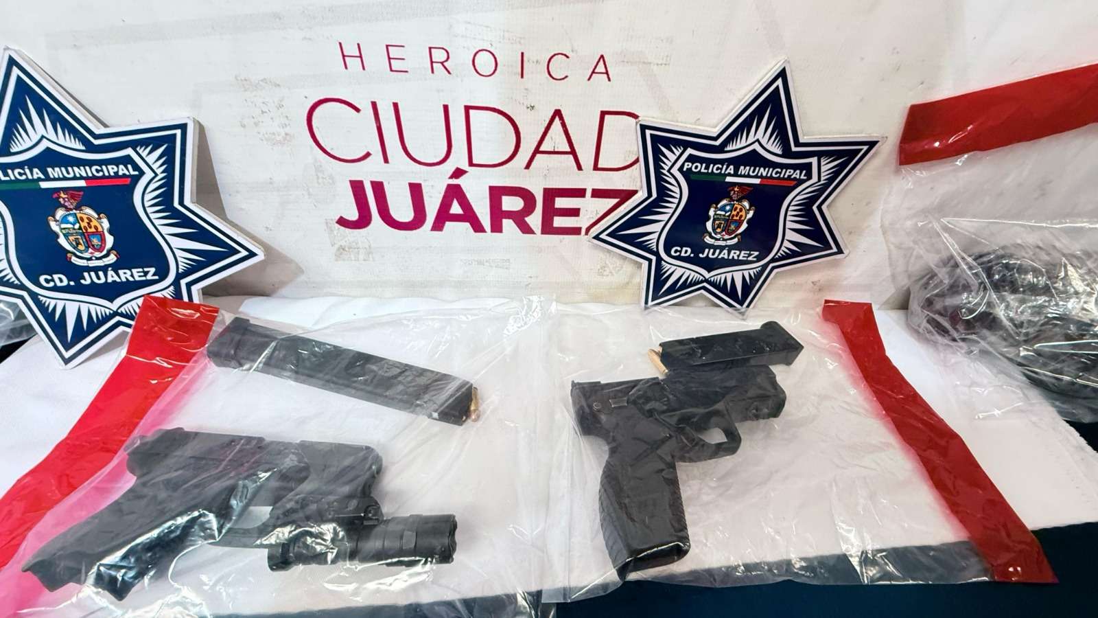 En el inmueble, se aseguraron dos armas de fuego tipo pistola, una de calibre .40, con un cargador abastecido con 27 cartuchos útiles, y otra calibre .9 milímetros, con un cargador abastecido con 18 cartuchos útiles, ambos artefactos sin el número de serie.