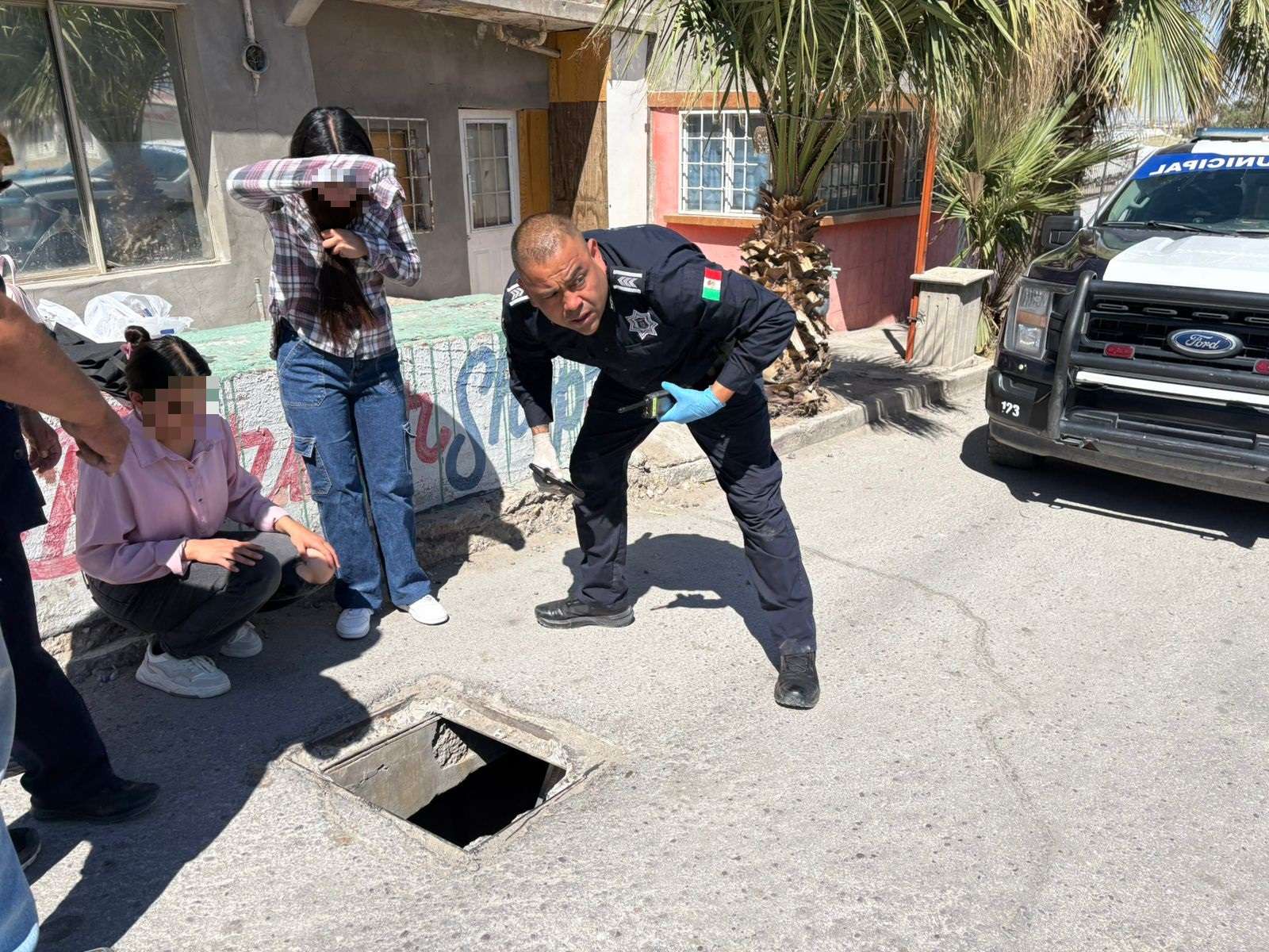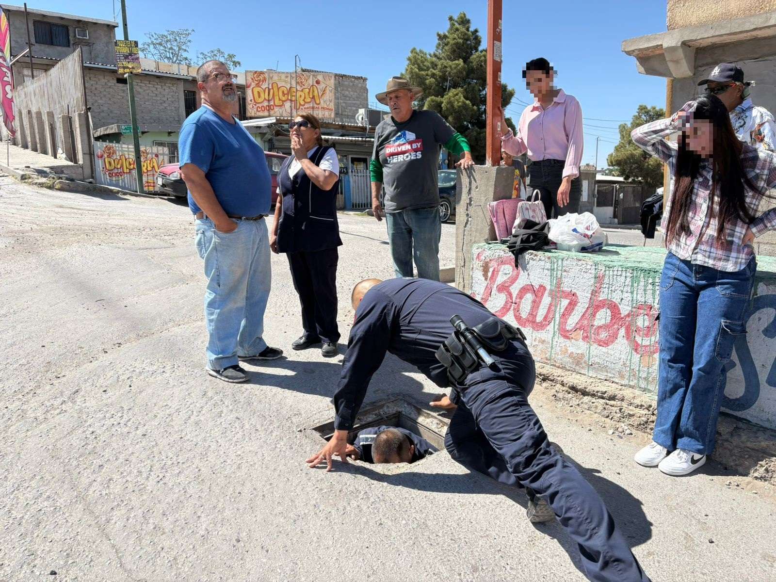 Ciudad Juárez.- Agentes de la Secretaría de Seguridad Pública Municipal lograron rescatar a un can que se encontraba atrapado en el fondo de una alcantarilla que se ubica en calles de la colonia Galeana.