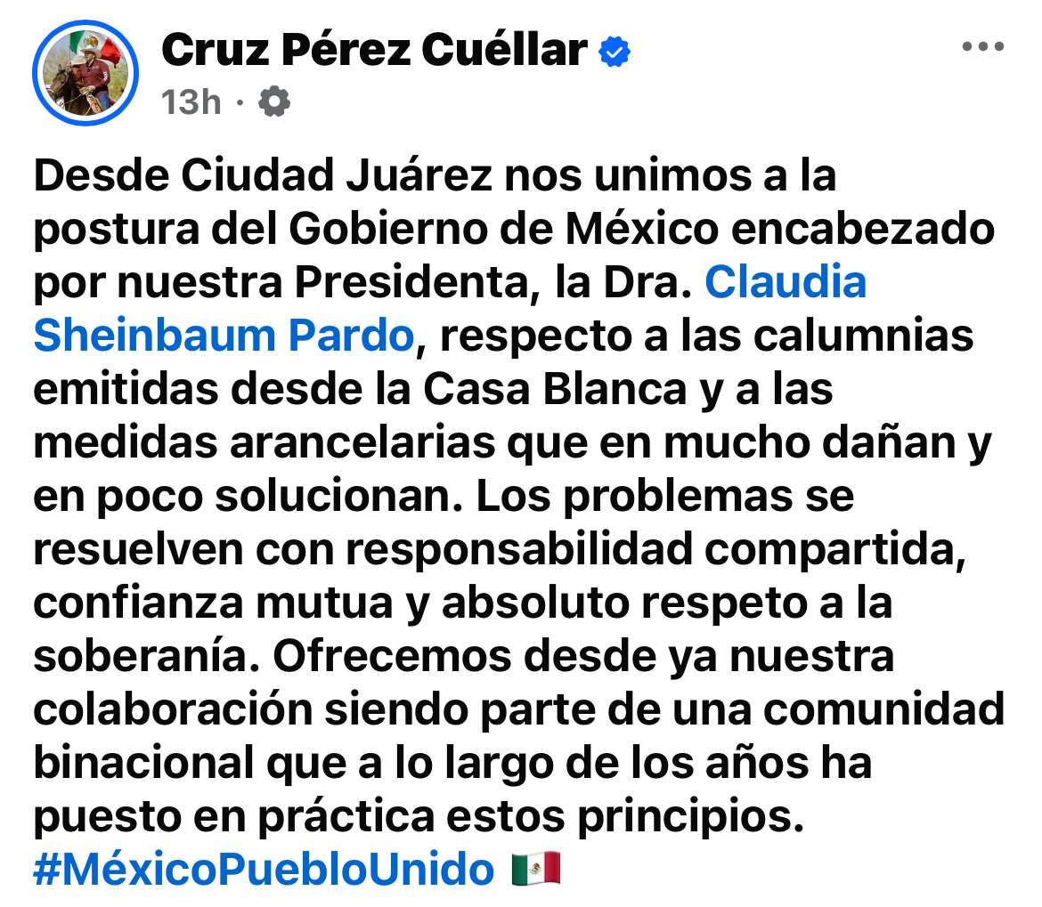 "Desde Ciudad Juárez nos unimos a la postura del Gobierno de México encabezado por nuestra Presidenta, la Dra. Claudia Sheinbaum Pardo, respecto a las calumnias emitidas desde la Casa Blanca y a las medidas arancelarias que en mucho dañan y en poco solucionan", manifiesta el alcalde juarense.