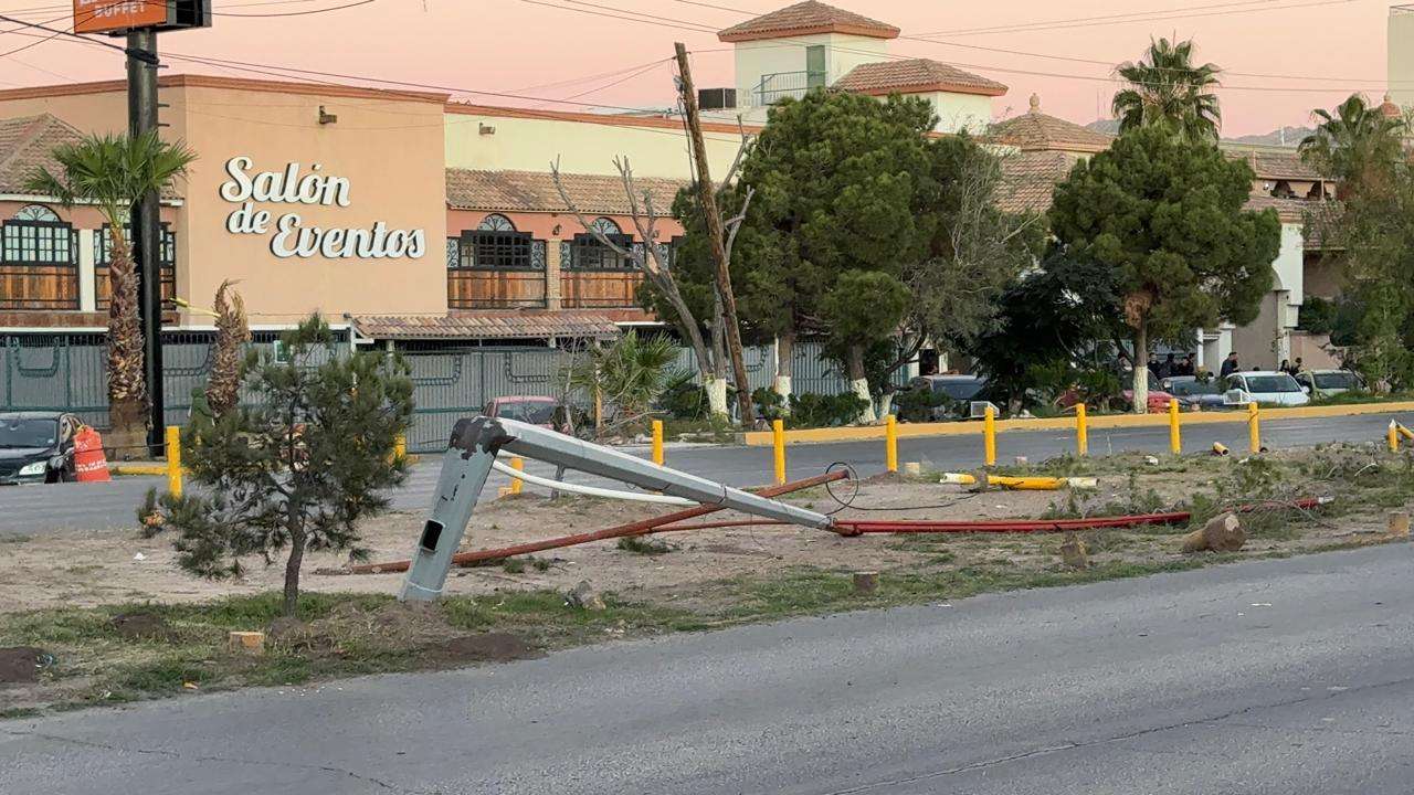 El camión impactó 4 tubos de contención, 4 árboles y un arbortante para finalmente derribar un poste de la CFE frente a un negocio de renta de vehículos.