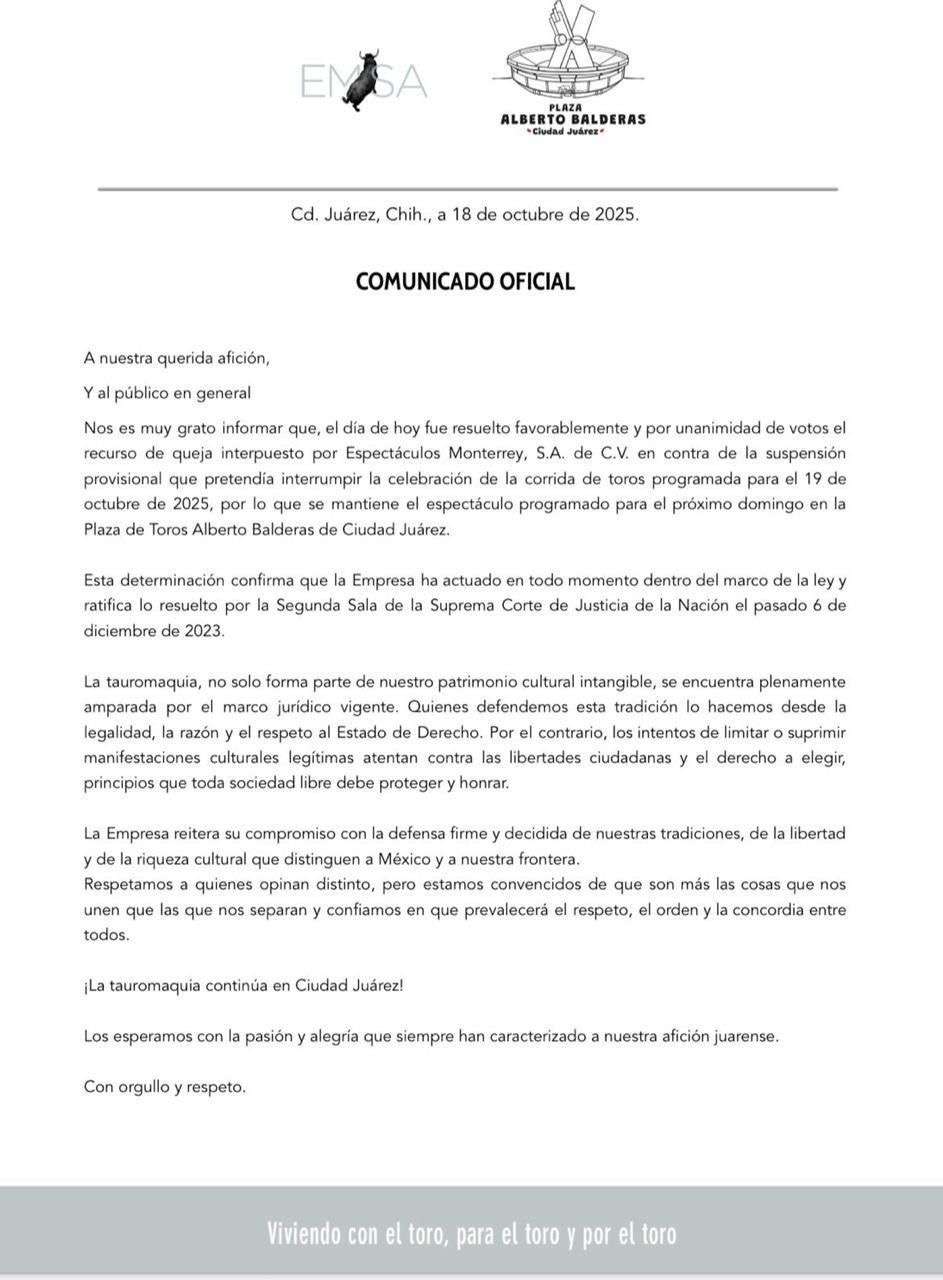Ciudad Juárez.- La empresa Espectáculos Monterrey, S.A. de C.V. (EMSA) informó que fue resuelto favorablemente y por unanimidad de votos el recurso de queja interpuesto en contra de la suspensión provisional que pretendía detener la corrida de toros programada para este domingo 19 de octubre de 2025 en la Plaza de Toros Alberto Balderas de Ciudad Juárez.