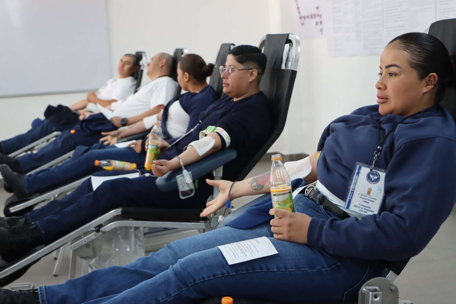 Ciudad Juárez.- Cadetes de la Academia Municipal de Policía que se encuentran en la etapa de formación inicial del curso básico para policía de proximidad de la Secretaría de Seguridad Pública Municipal, se sumaron a una campaña de donación de sangre este día.