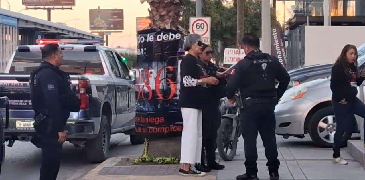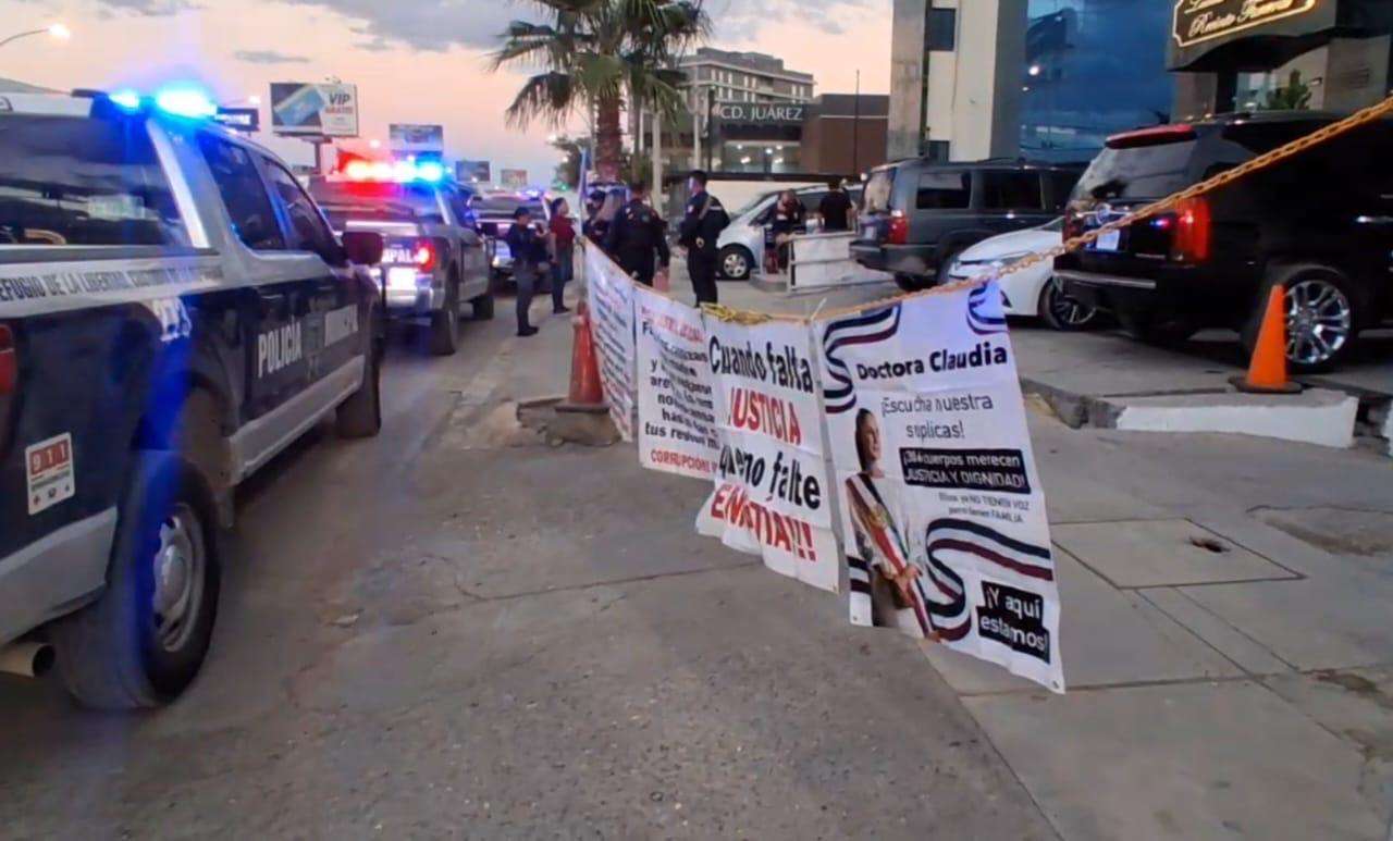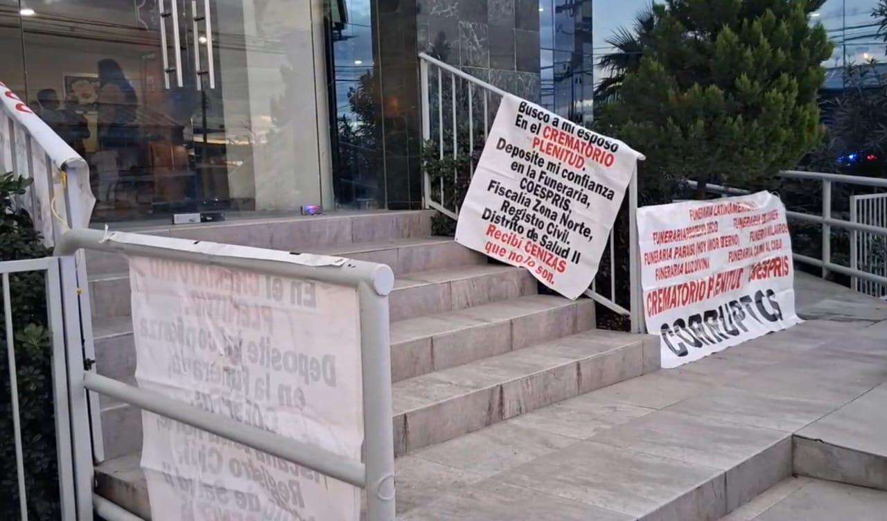 Ciudad Juárez.- Integrantes del Colectivo Justicia para Nuestros Deudos realizaron una protesta este viernes frente a la funeraria Latinoamericana, ubicada en la intersección de las avenidas Paseo Triunfo de la República y Lago de Pátzcuaro para exigir justicia tras el caso del crematorio Plenitud.