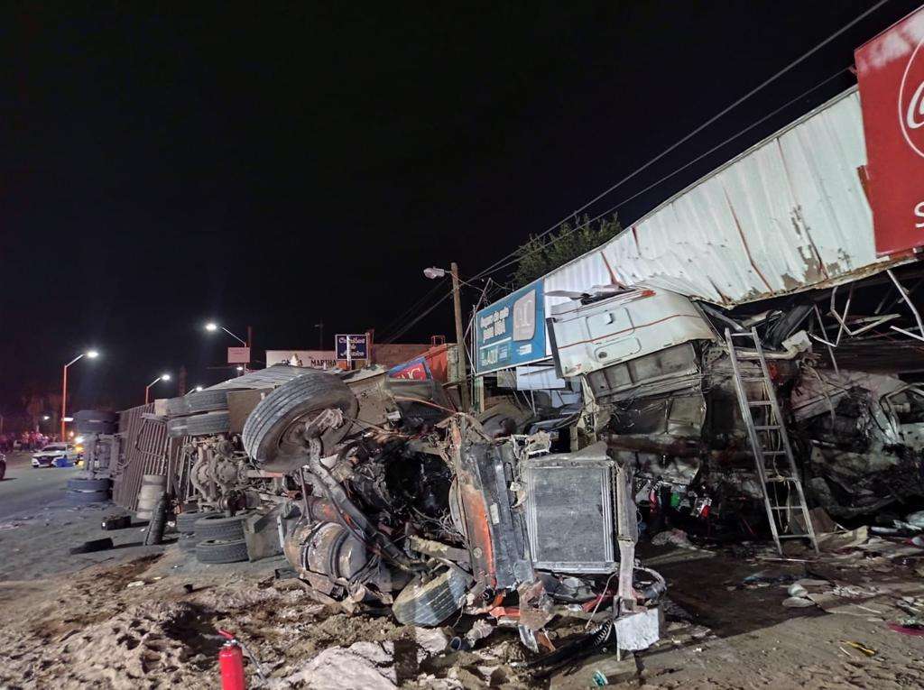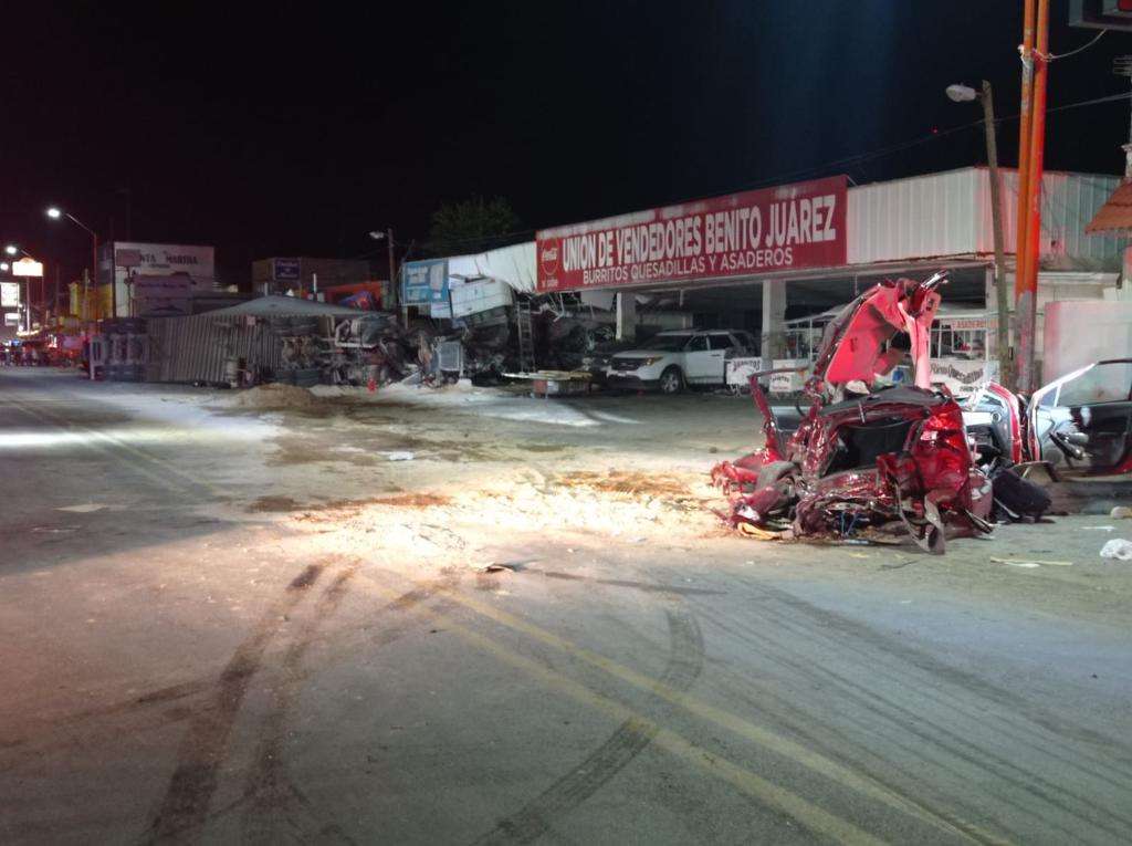 Ciudad Juárez.- En el accidente ocurrido hace unas horas en la calle principal de Villa Ahumada en la que un tráiler a alta velocidad impactó a vehículos y cayó de costado sobre la Unidad de Vendedores Benito Juárez, ha subido el número de muertos a 10 y 17 lesionados.