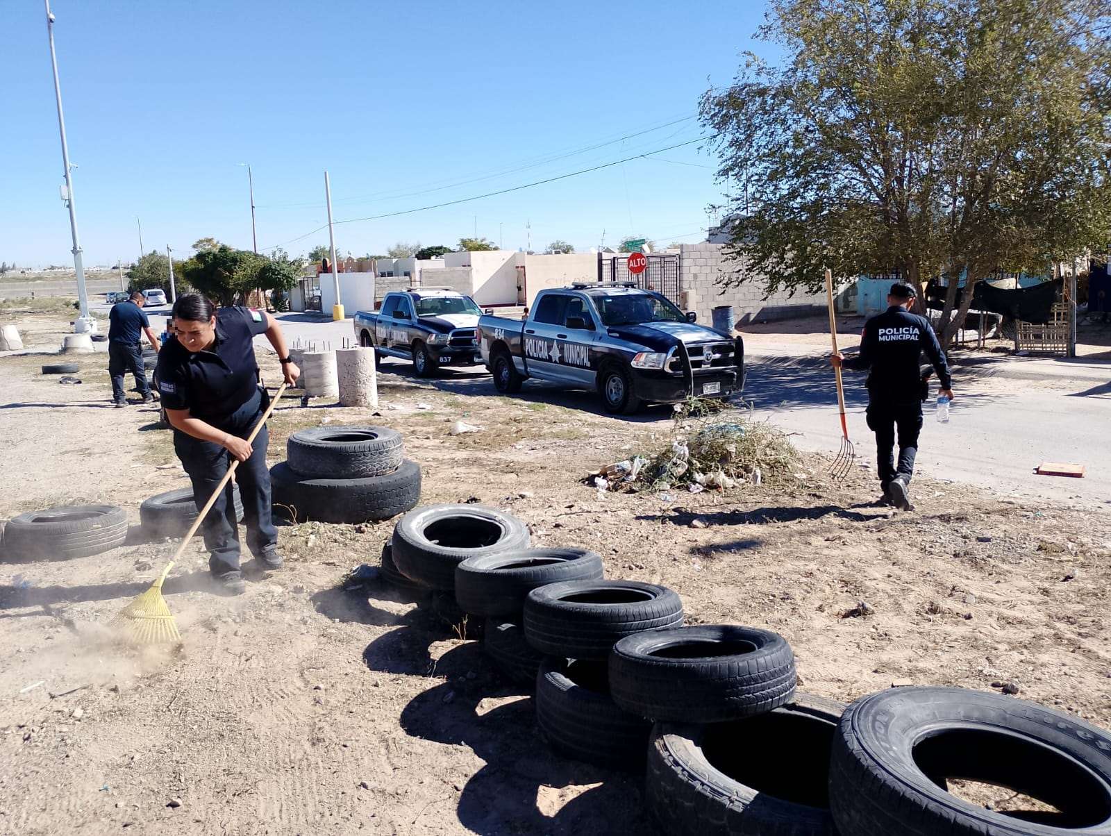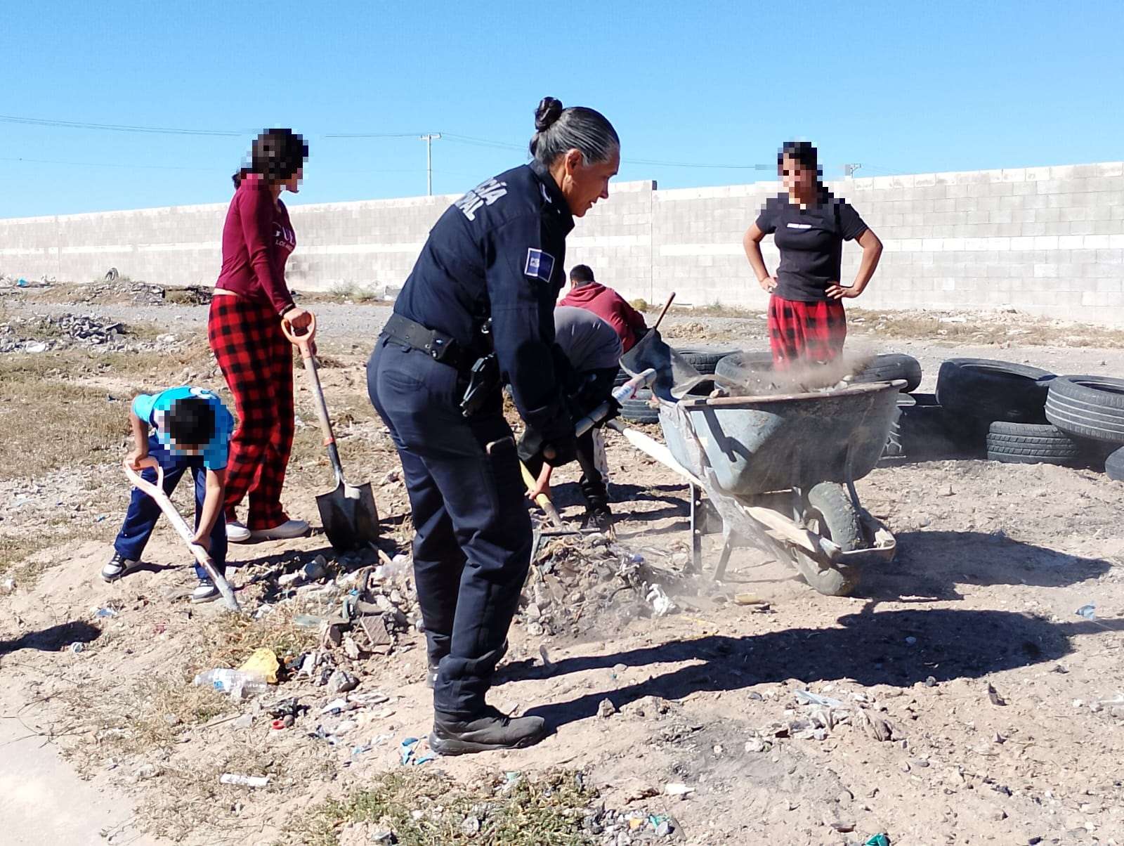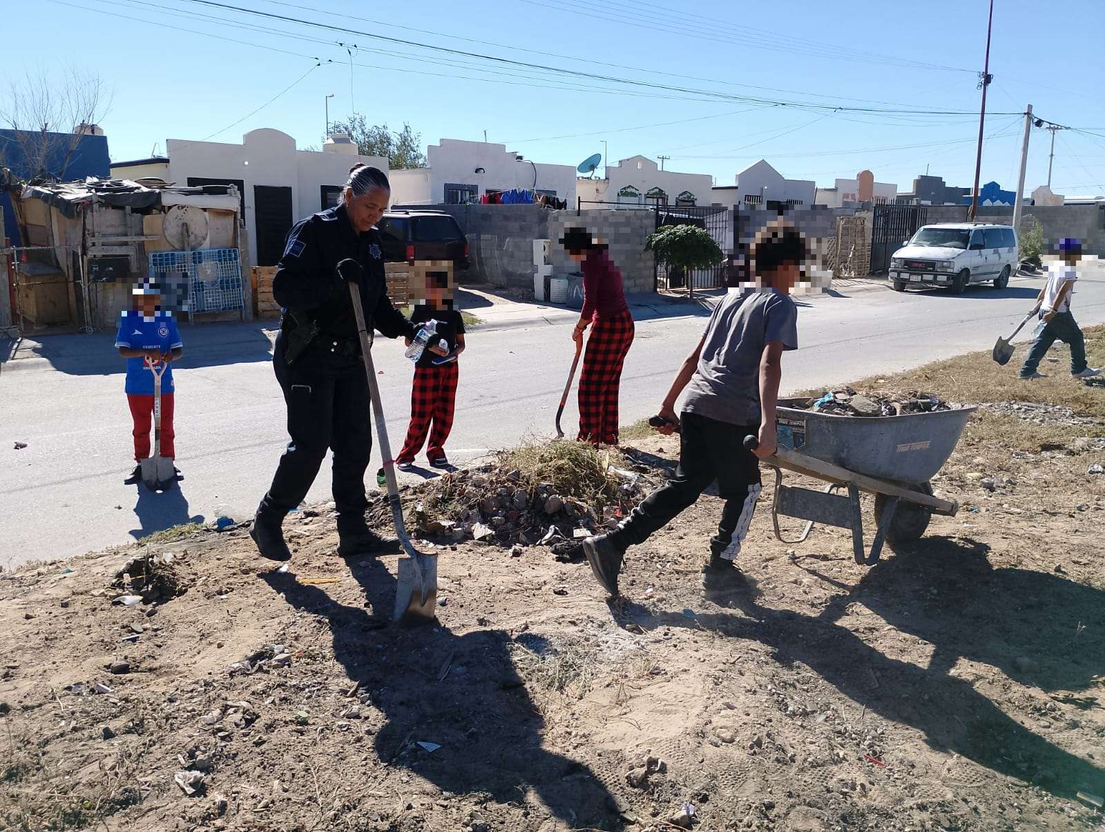 Ciudad Juárez.- En una muestra de colaboración comunitaria y compromiso con el bienestar de la juventud, elementos de la Secretaría de Seguridad Pública Municipal, junto con niños, niñas y adolescentes del fraccionamiento Senderos de Oriente, unieron fuerzas para limpiar y habilitar un lote baldío ubicado en el cruce de las calles Senderos de Grava y Senderos del Occidente, con el objetivo de convertir este espacio en una pequeña cancha de fútbol para el disfrute recreativo de los jóvenes de la colonia.