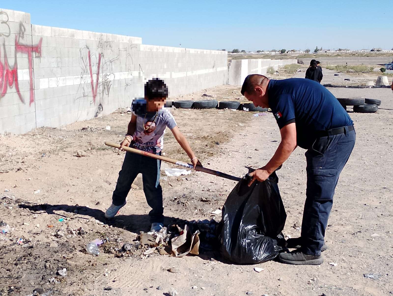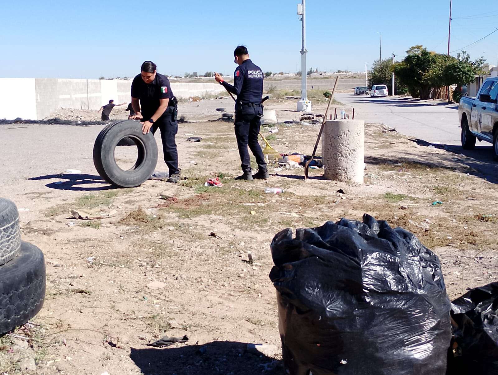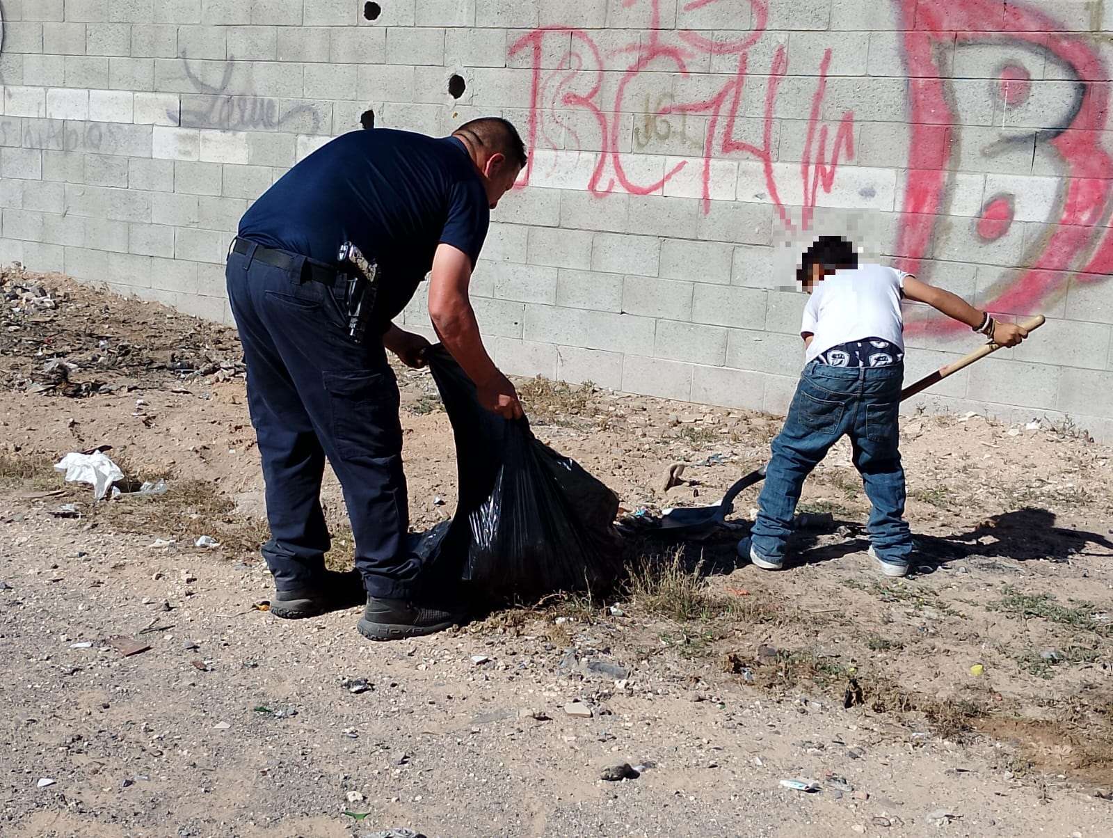 Ciudad Juárez.- En una muestra de colaboración comunitaria y compromiso con el bienestar de la juventud, elementos de la Secretaría de Seguridad Pública Municipal, junto con niños, niñas y adolescentes del fraccionamiento Senderos de Oriente, unieron fuerzas para limpiar y habilitar un lote baldío ubicado en el cruce de las calles Senderos de Grava y Senderos del Occidente, con el objetivo de convertir este espacio en una pequeña cancha de fútbol para el disfrute recreativo de los jóvenes de la colonia.