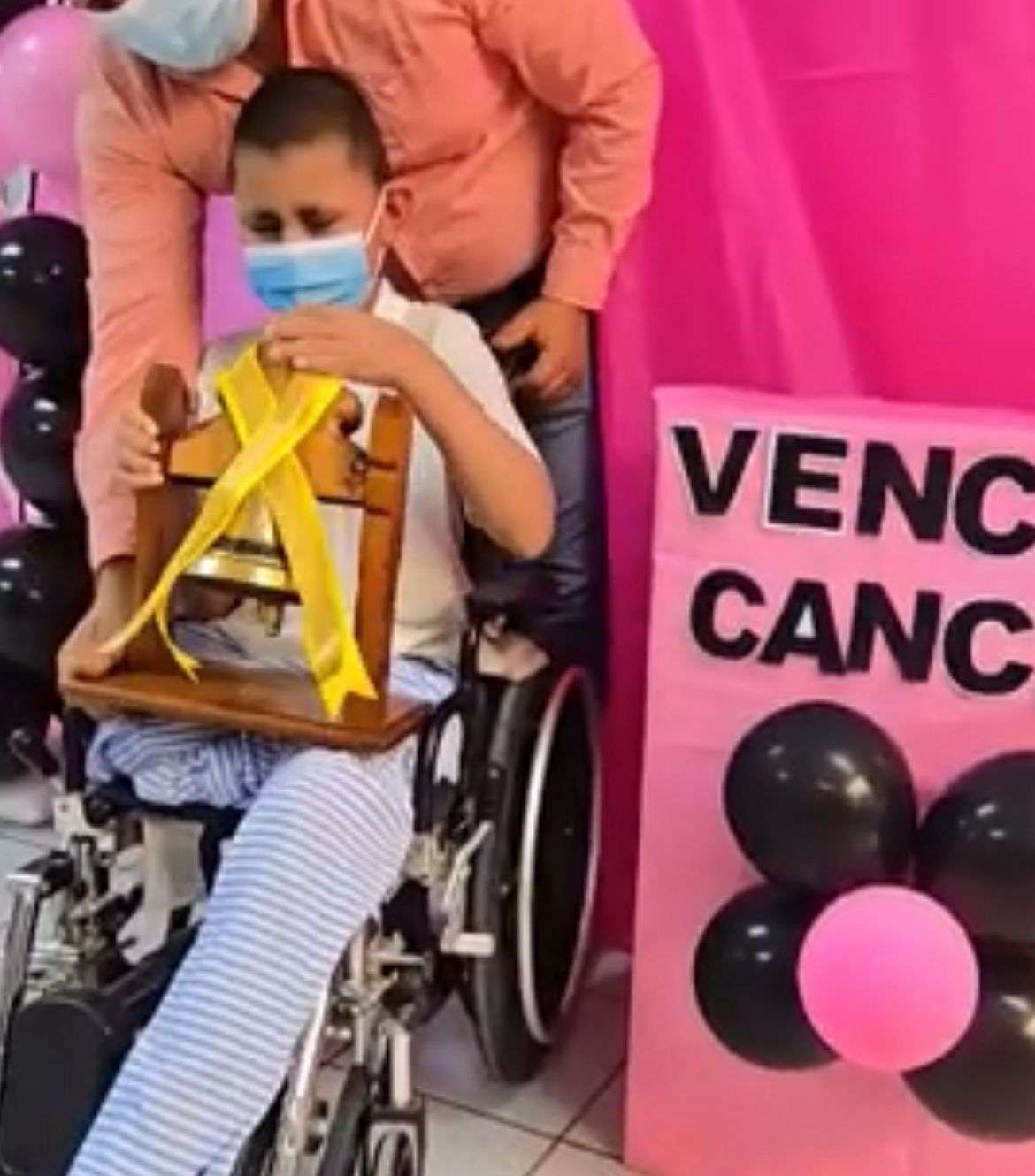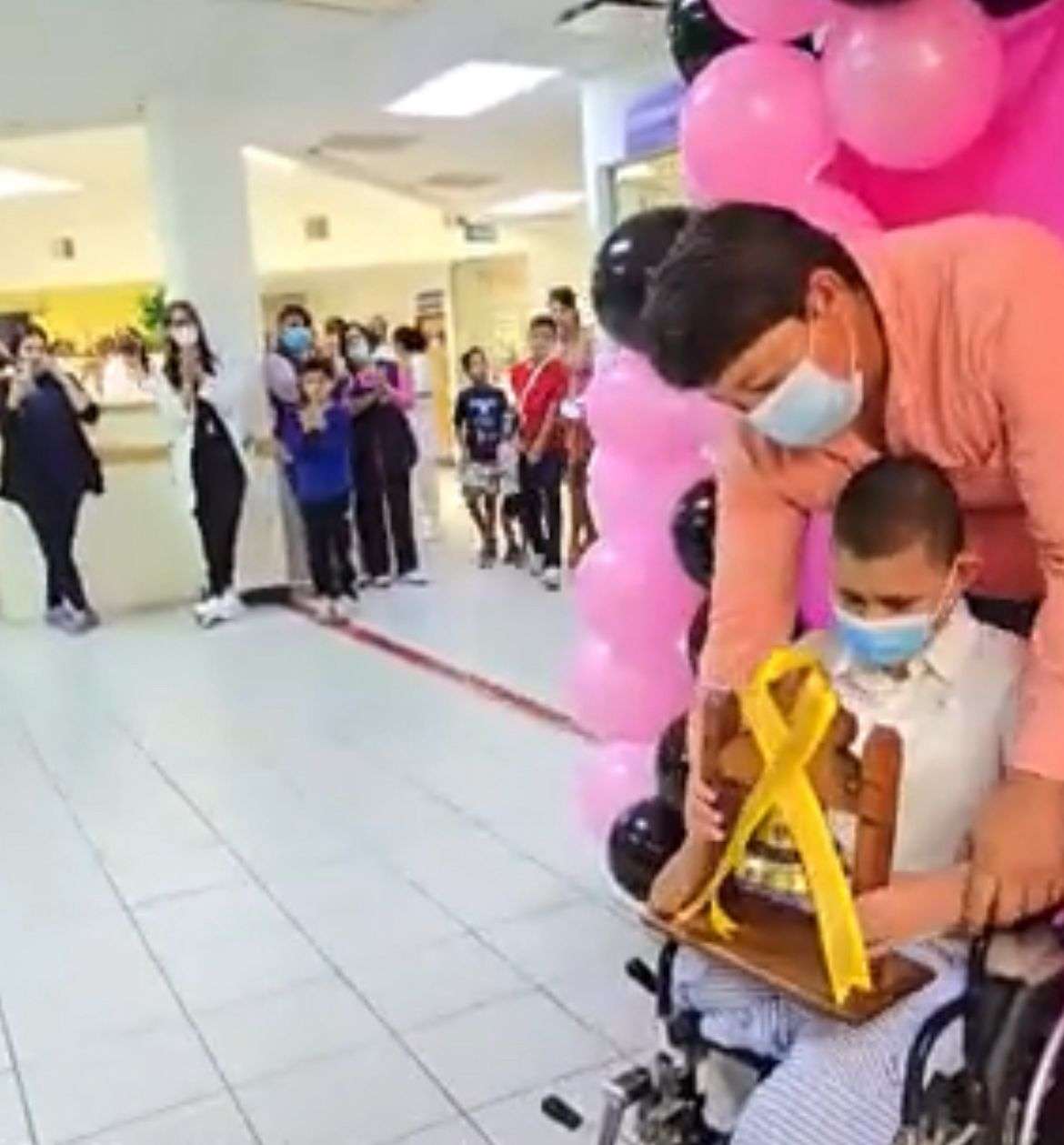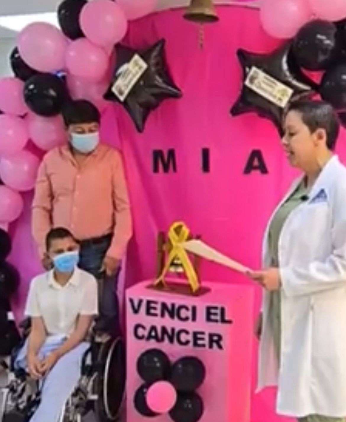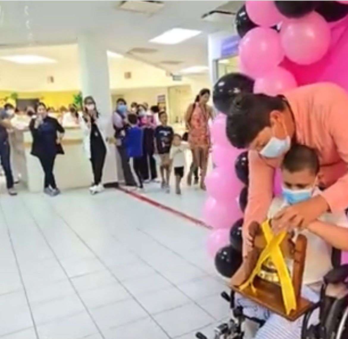 Con una sonrisa tímida y lágrimas contenidas, Mía cruzó el patio principal del hospital, decorado con globos de colores y un letrero que decía “Vencí el cáncer”.
