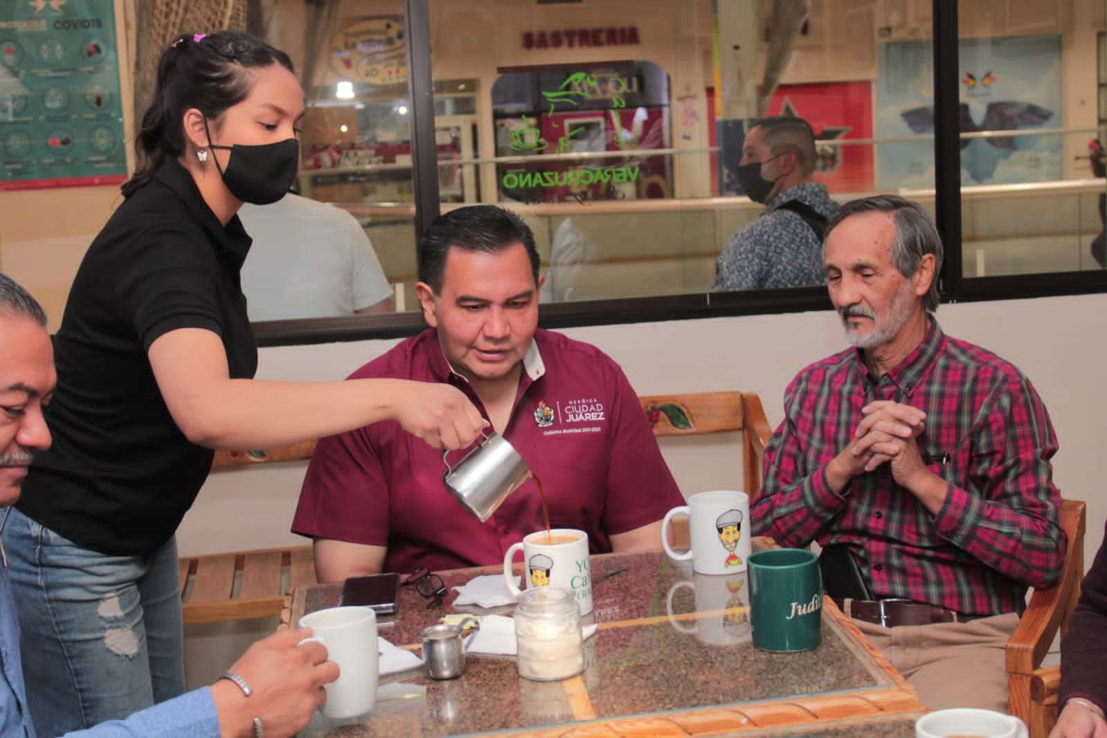 Ciudad Juárez.- Como parte del esquema de promoción de los pequeños negocios, este día el Presidente Municipal, Cruz Pérez Cuéllar, visitó el Café Veracruzano, ubicado en Plaza de Las Américas.