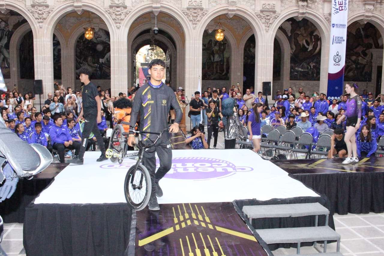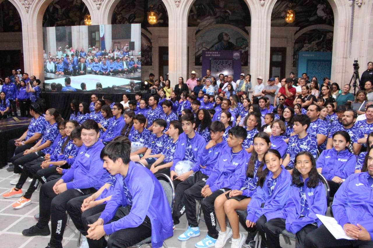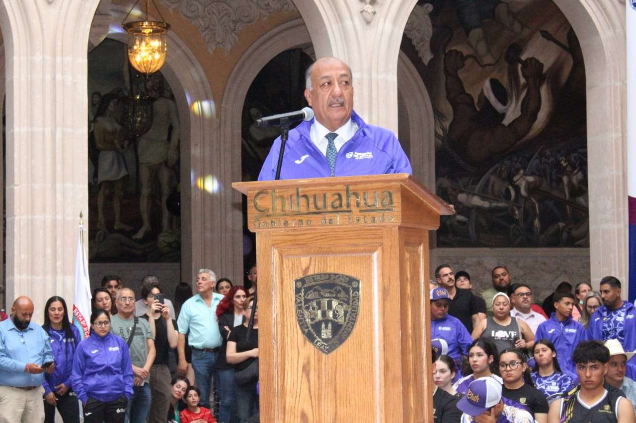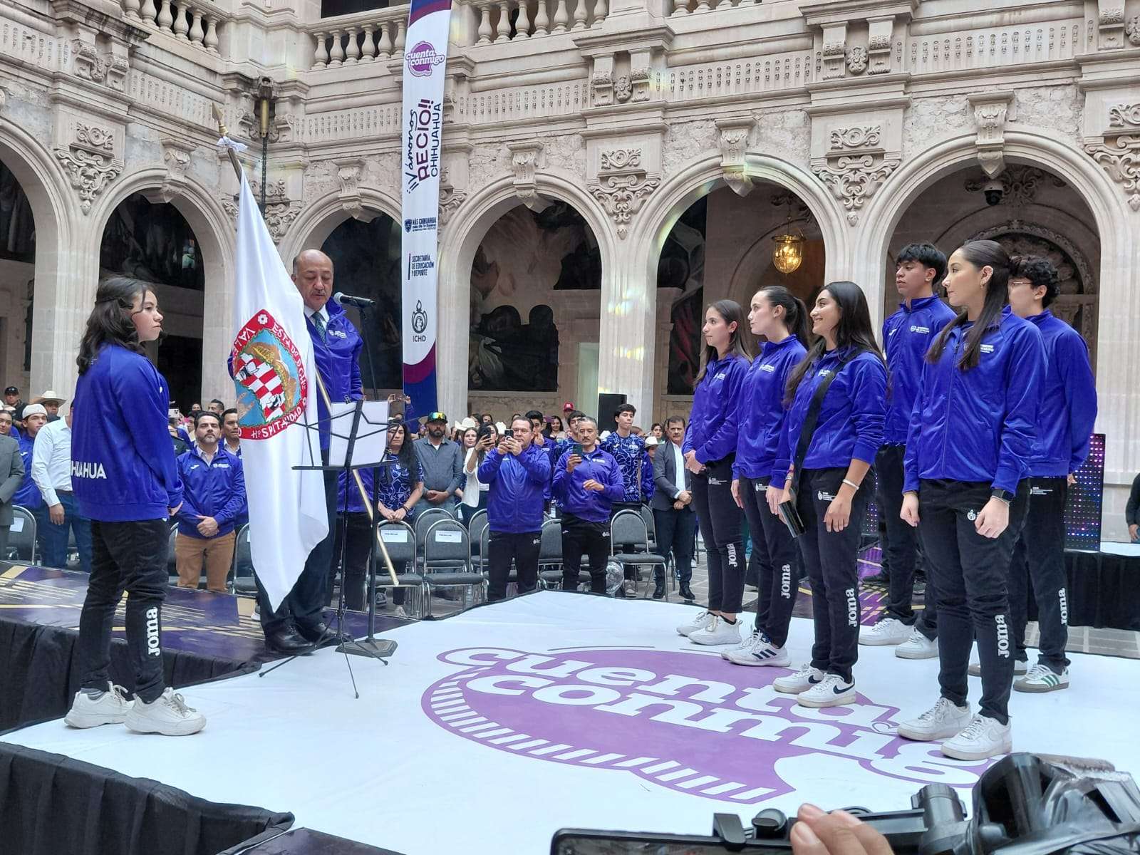 Chihuahua.- Esta tarde, se llevó a cabo el abanderamiento de la delegación chihuahuense para la Olimpiada Nacional 2025, en el Patio Central del Palacio de Gobierno.