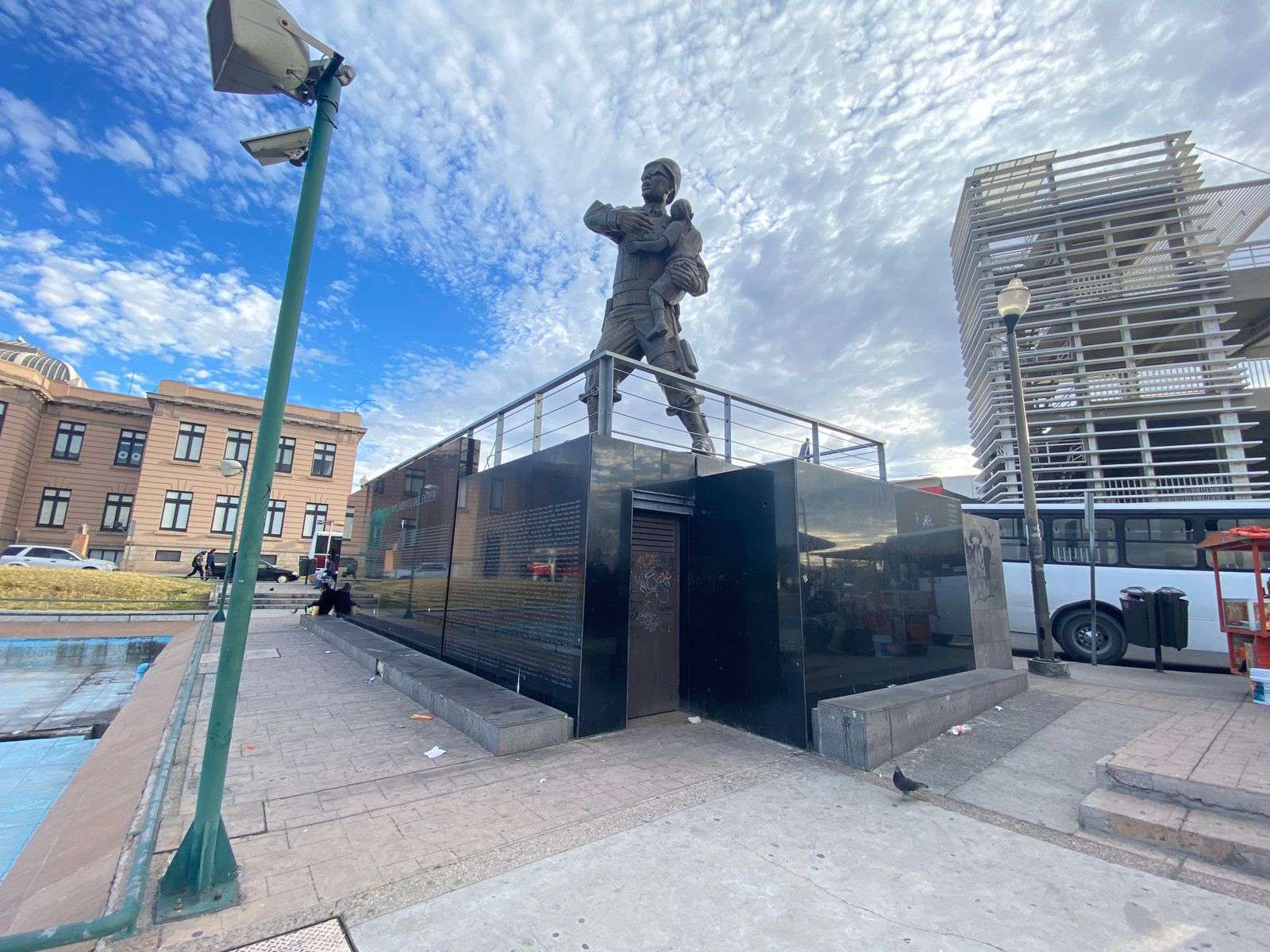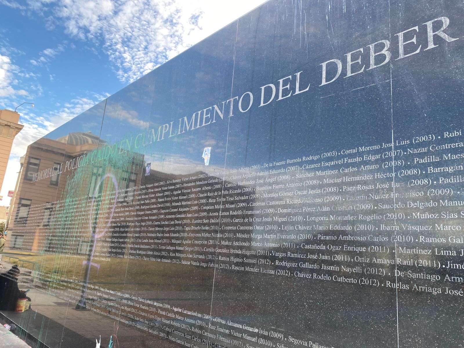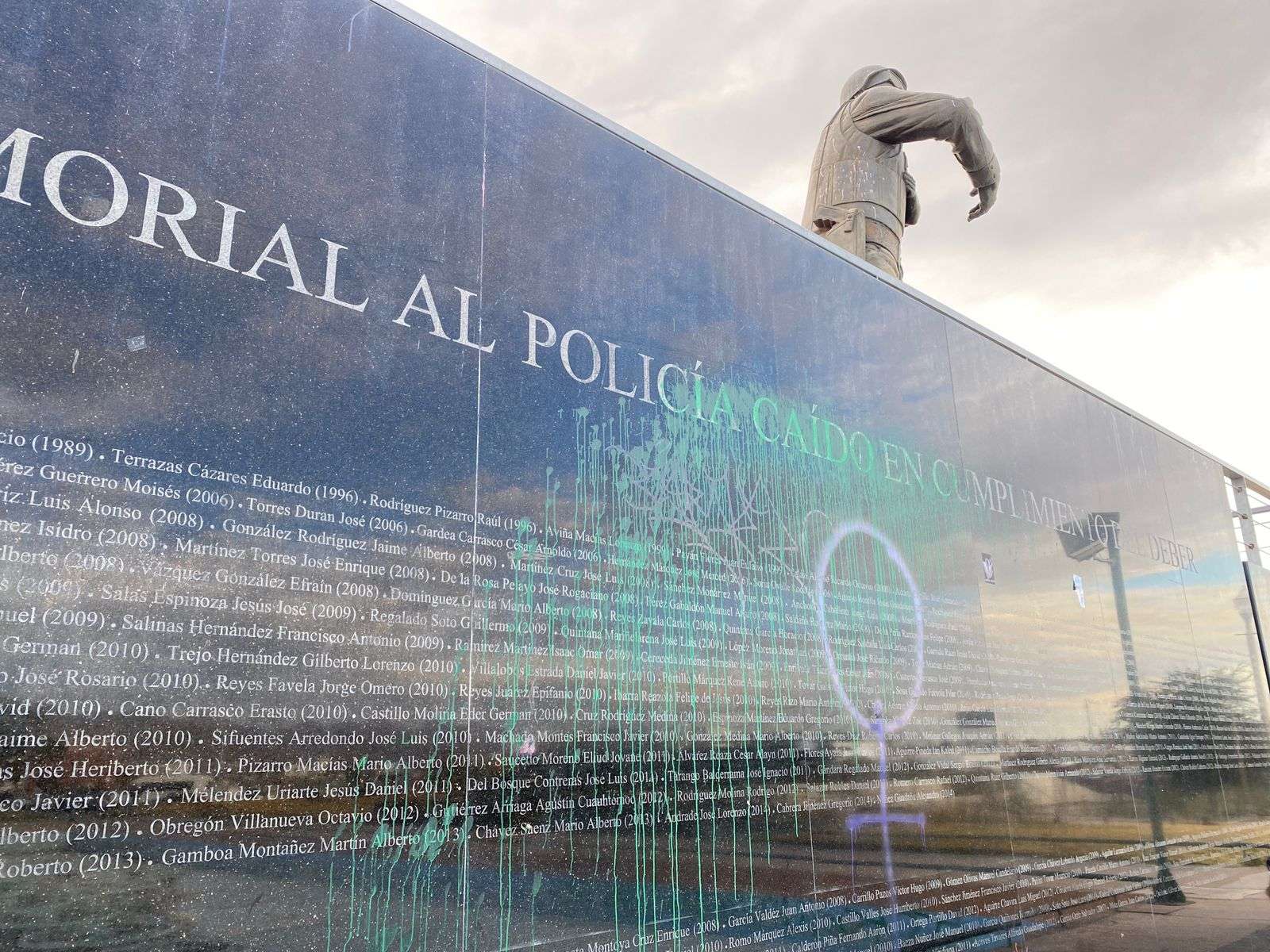 En la piedra que lleva grabado los 543 nombres de los elementos que murieron en defensa de los ciudadanos –en aquel tiempo de guerra en las calles de la ciudad (1986-2014)–, resaltan las pintarrajeadas con aerosol, los cúmulos de basura de chucherias y la falta de iluminación.