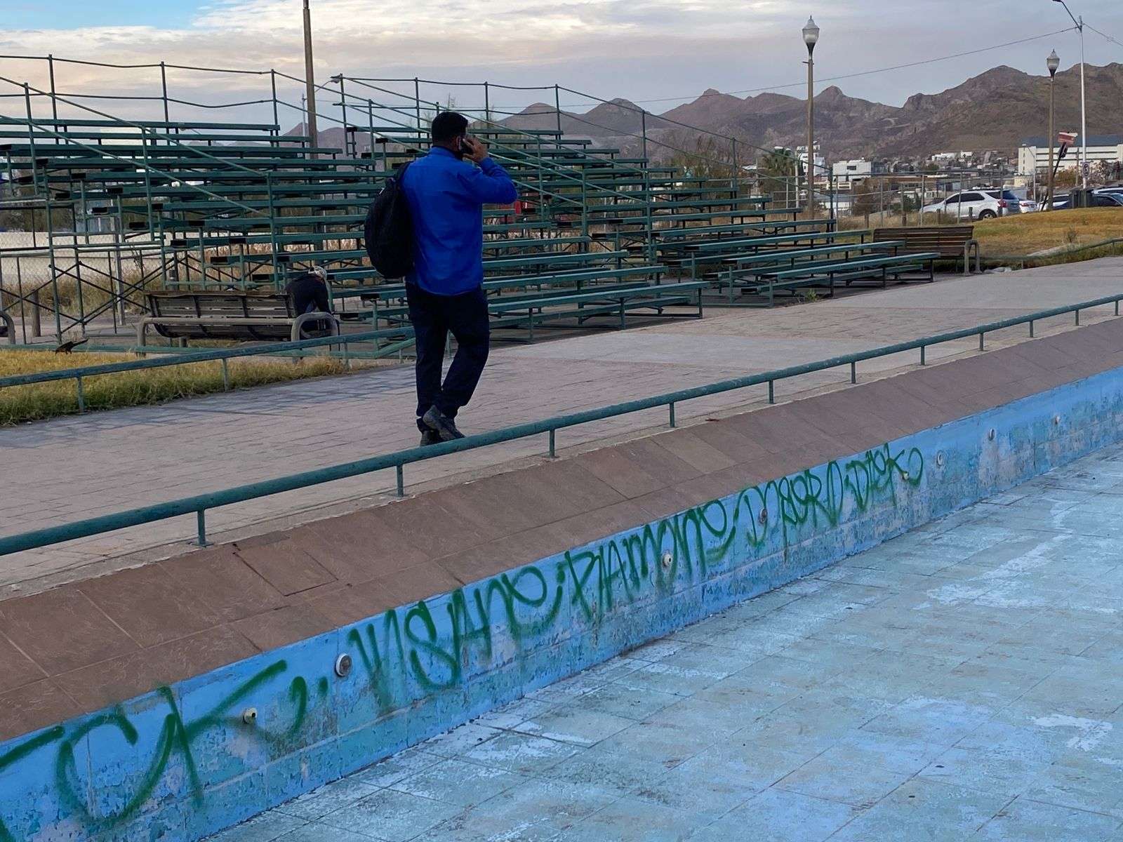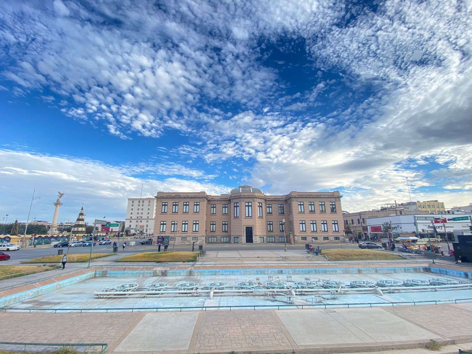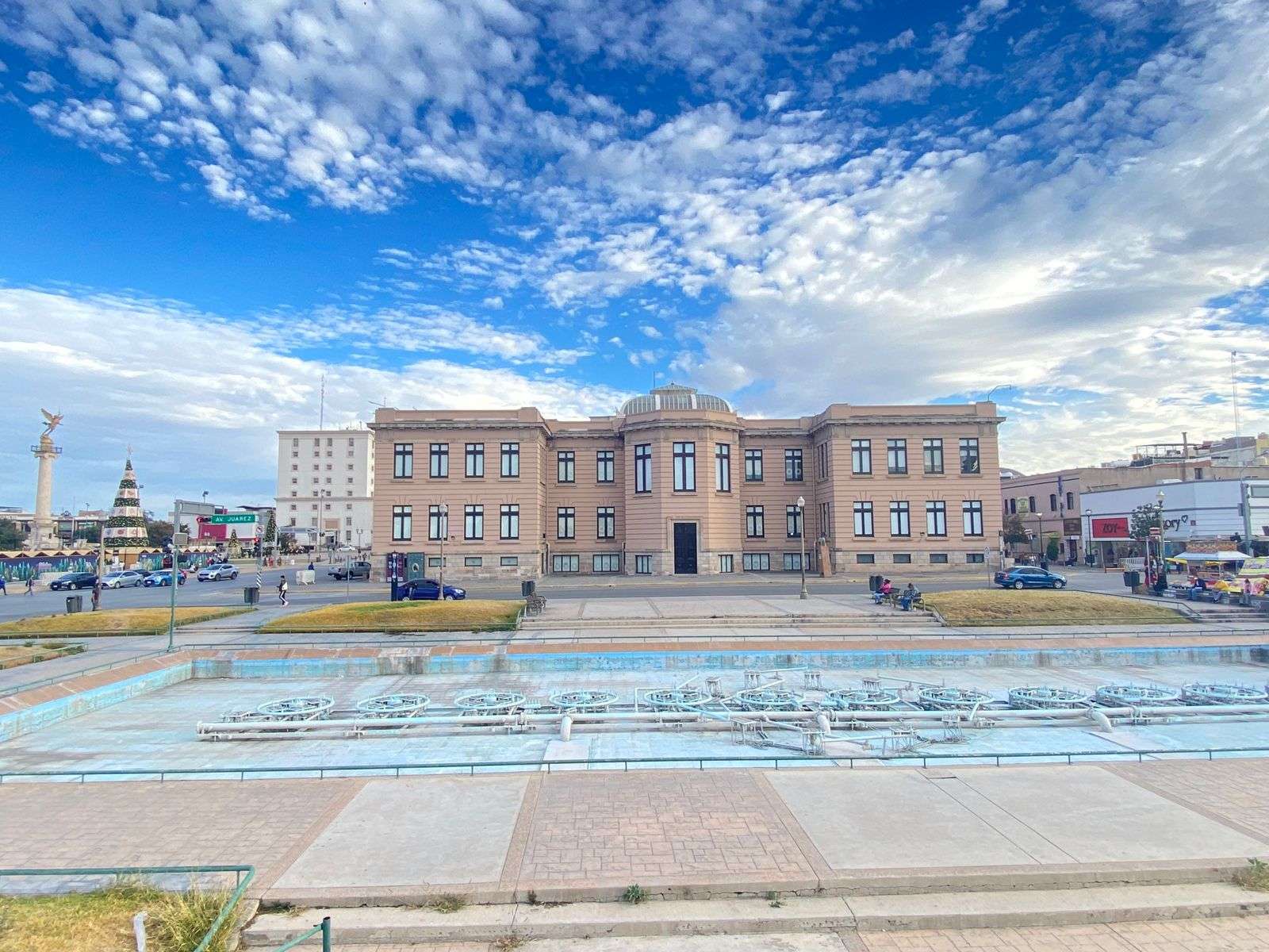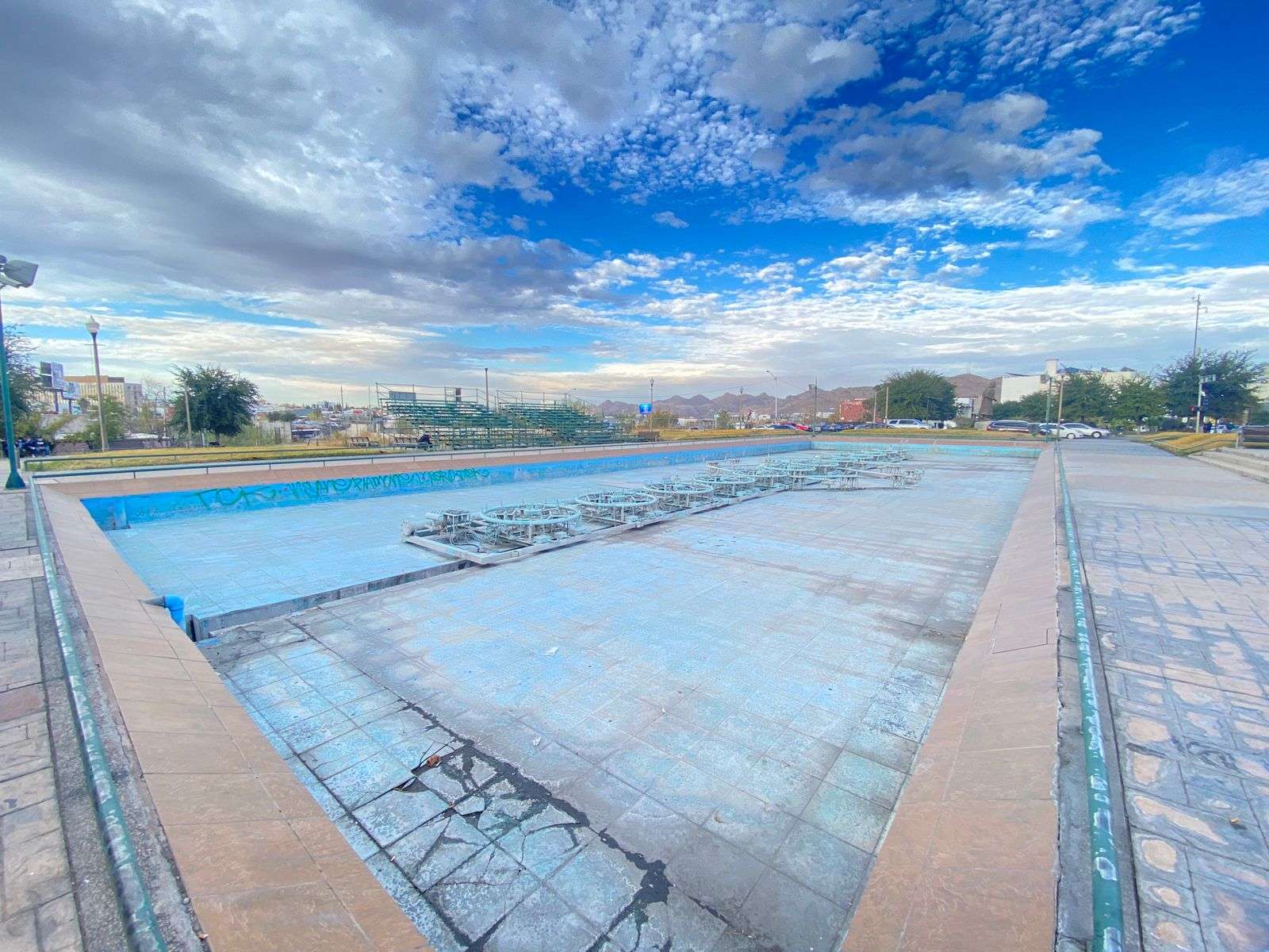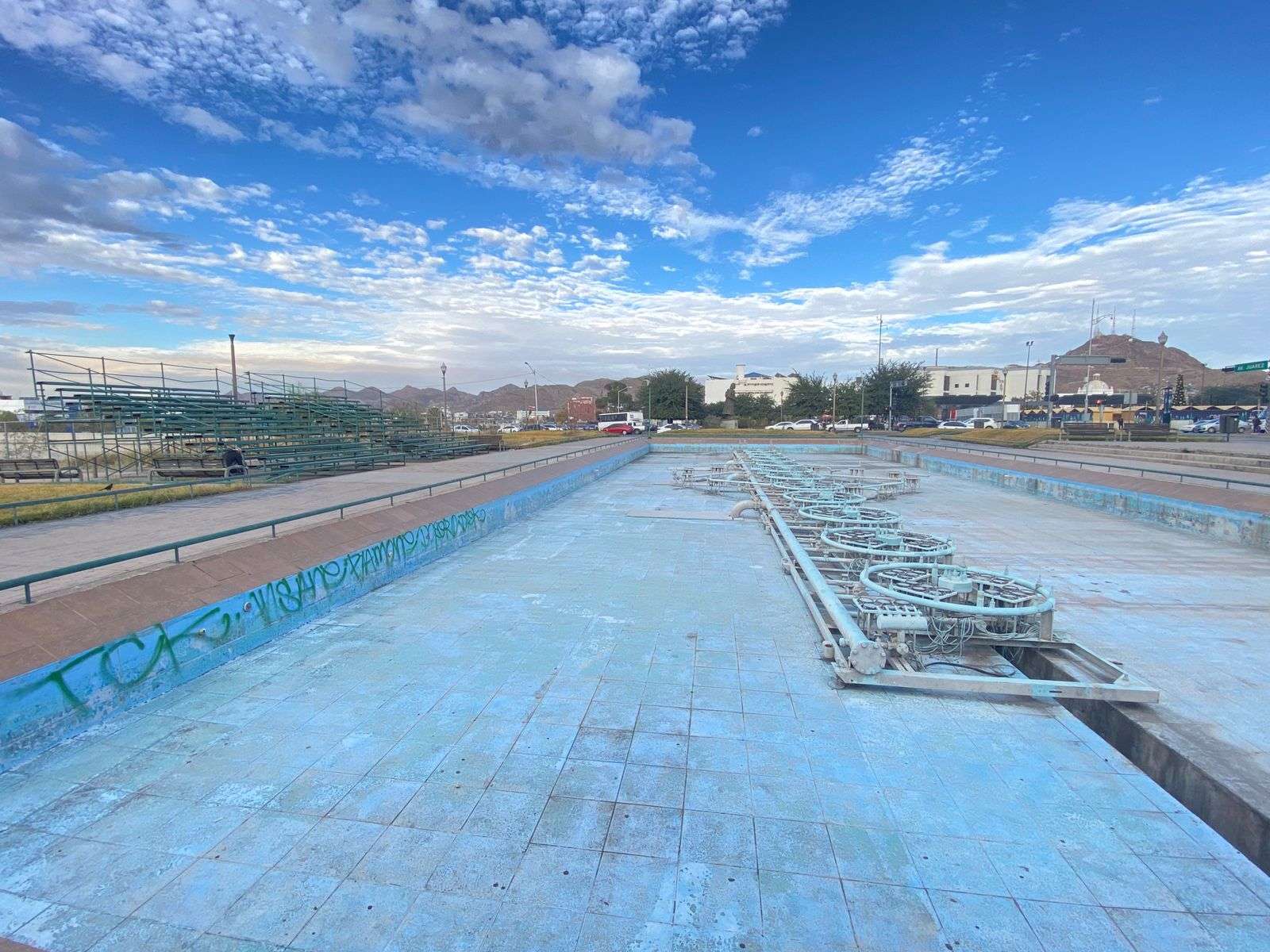 Chihuahua.- Pintarrajeada, sin espíritu y totalmente abandonada del manto gubernamental, luce la irreconocible Plaza de Las Fuentes Danzarinas desde hace más de 6 años, en las inmediaciones del Centro Histórico.