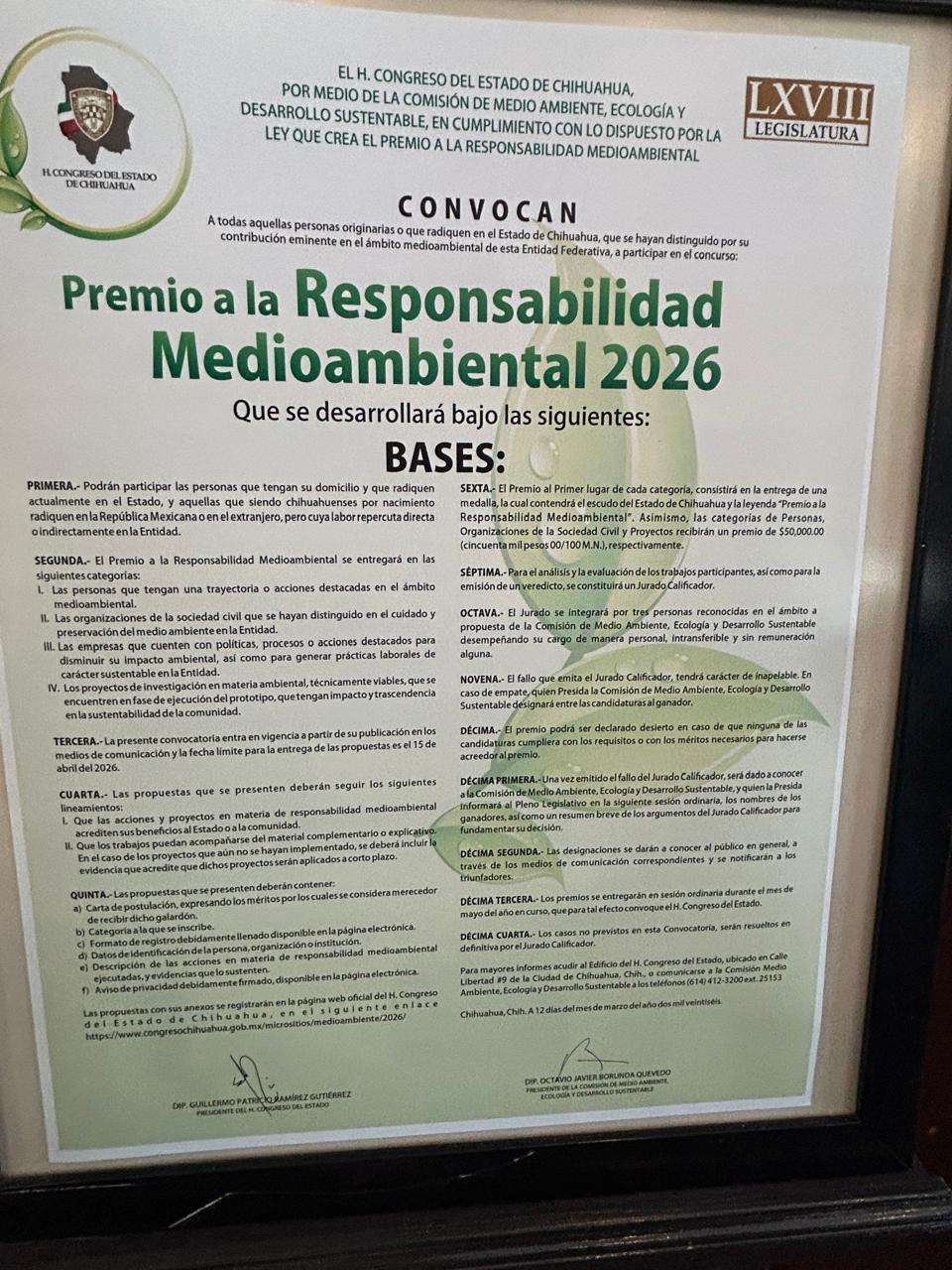 Chihuahua.— El diputado Octavio Borunda Quevedo, integrante del Partido Verde Ecologista de México (PVEM), anunció oficialmente el lanzamiento de la convocatoria para el Premio a la Responsabilidad Medioambiental, edición 2026.