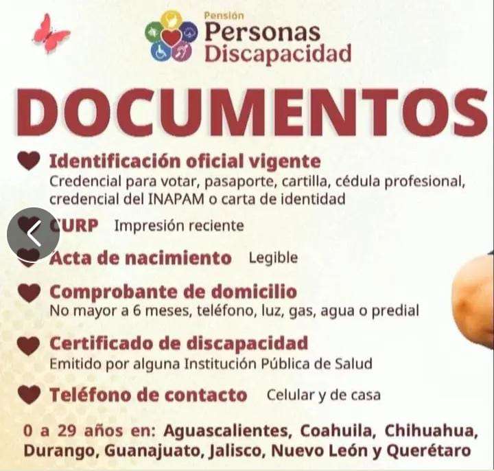 Para realizar el trámite, es necesario presentar identificación oficial vigente, CURP reciente, acta de nacimiento legible, comprobante de domicilio no mayor a seis meses, certificado de discapacidad emitido por una institución pública de salud y un número telefónico de contacto.