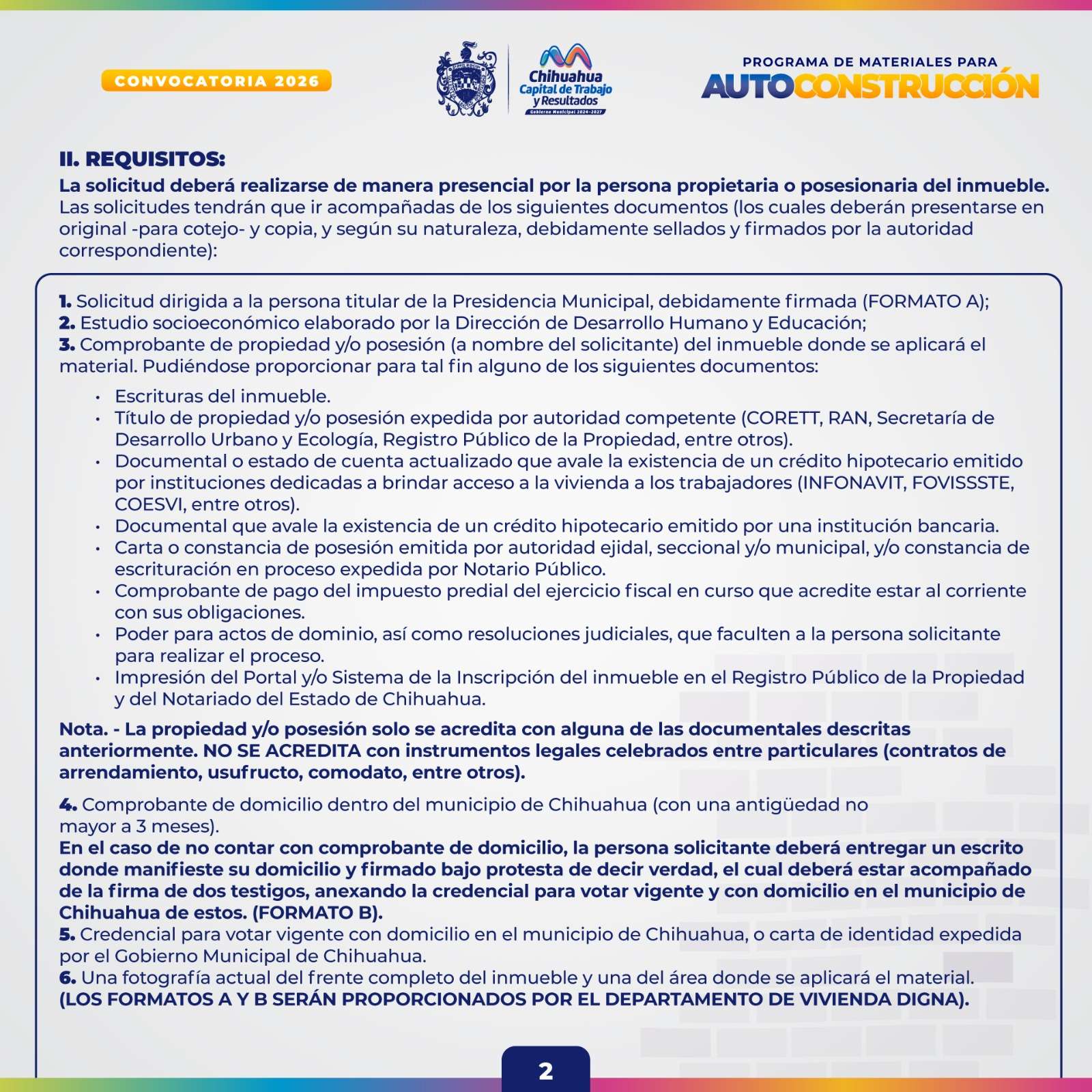 La convocatoria estará disponible en las redes sociales del Gobierno Municipal. Para participar, será necesario presentar una solicitud debidamente firmada, estudio socioeconómico, comprobante de propiedad o posesión del inmueble, identificación oficial vigente, comprobante de domicilio y fotografías del inmueble. No se recibirán solicitudes con documentación incompleta o fuera de tiempo.