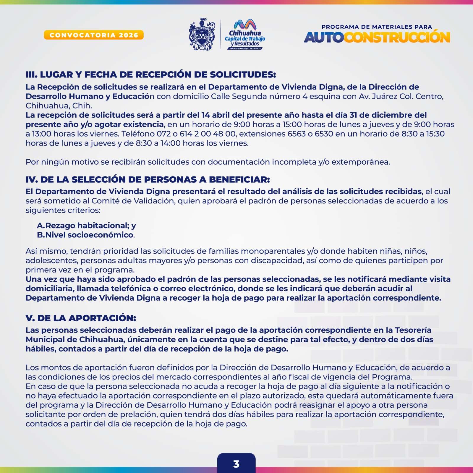 Chihuahua.- El Gobierno Municipal de Chihuahua, a través de la Dirección de Desarrollo Humano y Educación, invita a la ciudadanía a participar en la convocatoria del Programa Materiales para Autoconstrucción 2026, dirigido a personas mayores de edad y familias en situación de vulnerabilidad.