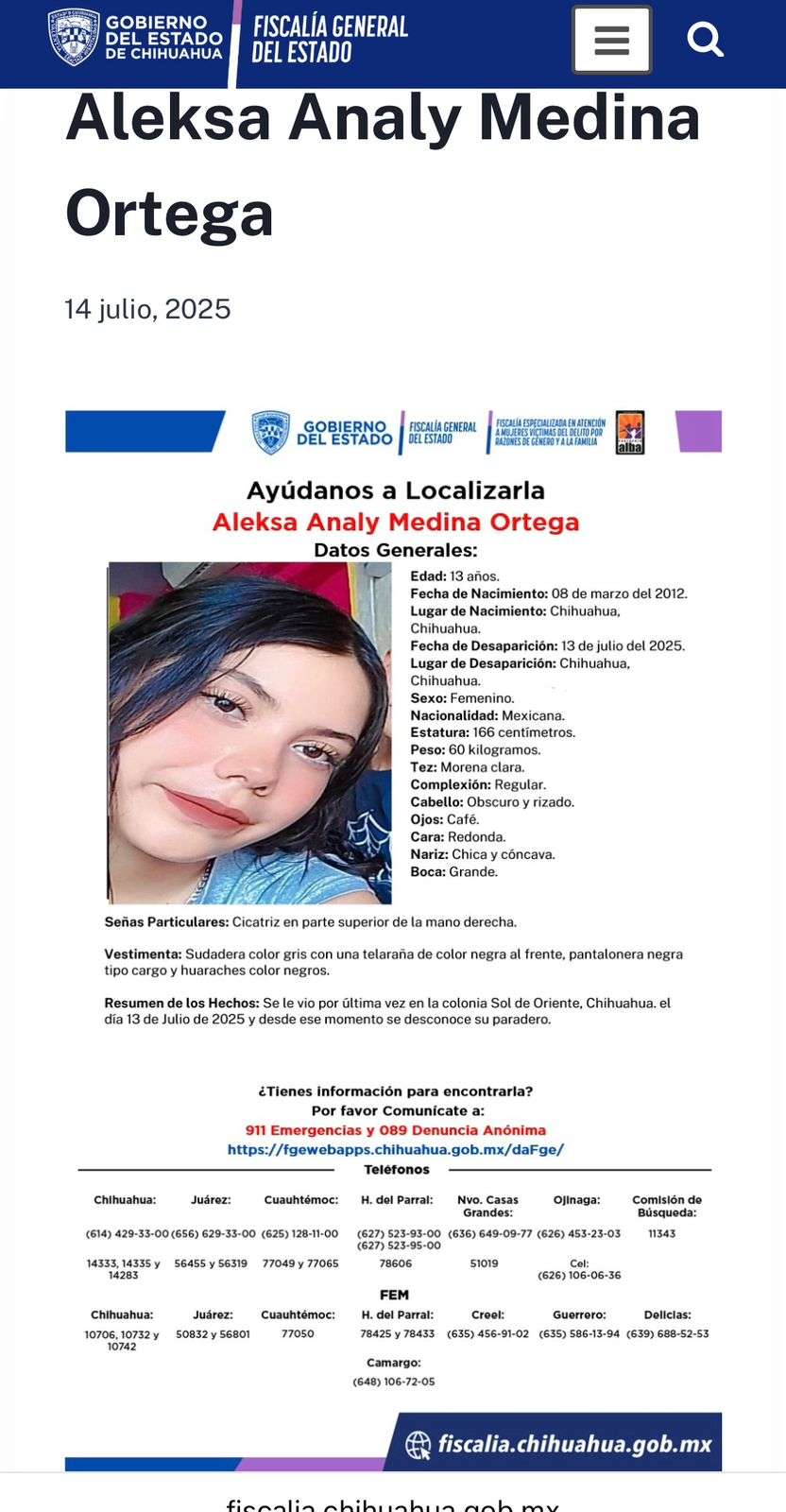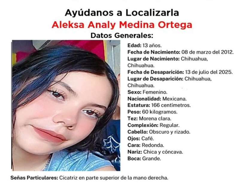 Chihuahua.- La Fiscalía General del Estado activó protocolo Alba para dar con el paradero de la menor Aleksa Analy Medina Ortega, de 13 años.
