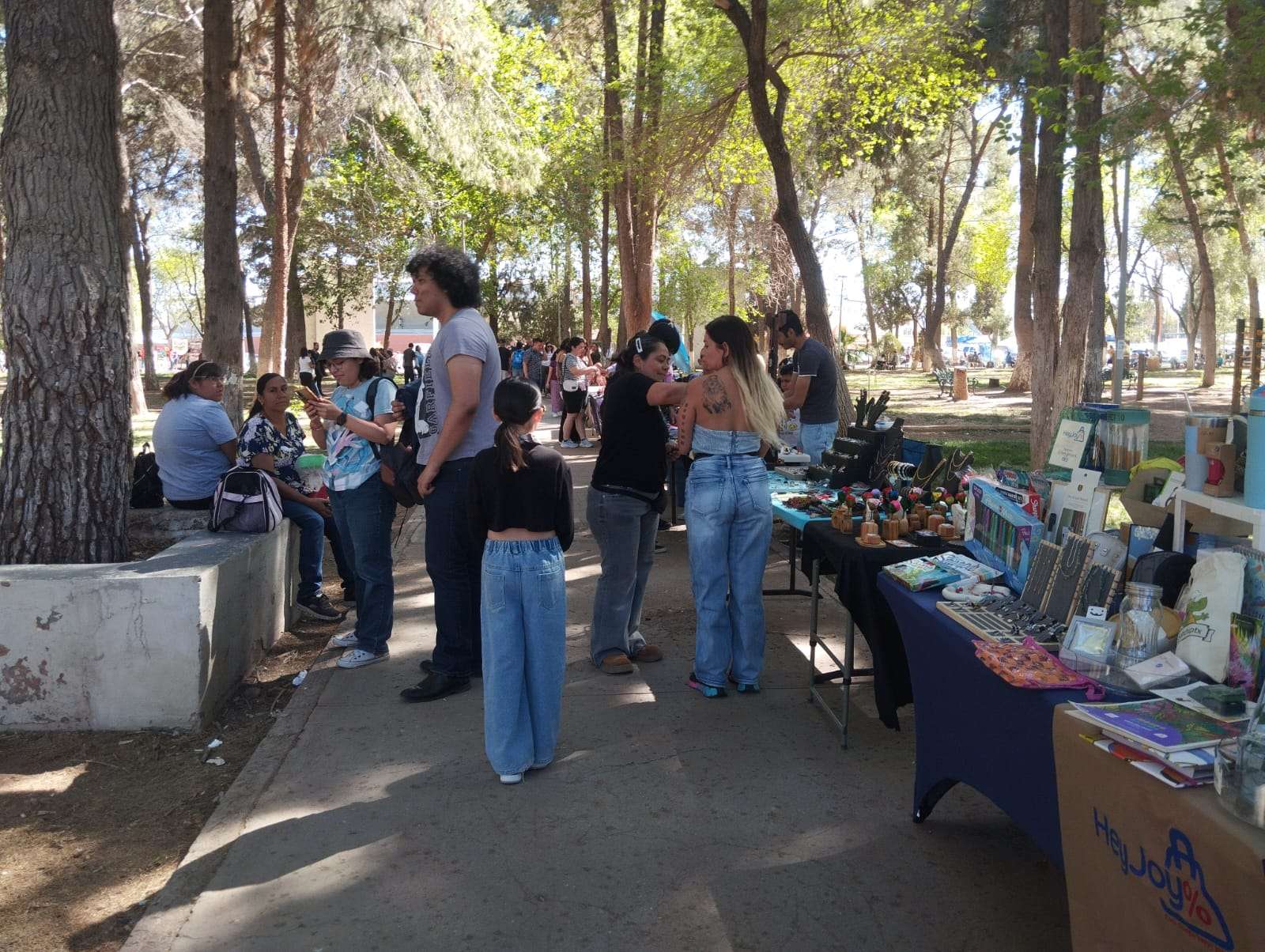 Pese a la densa arboleda de la Deportiva, la sombra natural resultó insuficiente frente al intenso calor, lo que obligó a que tanto la kermés institucional como la venta de productos de la Sierra Tarahumara se desarrollaran bajo carpas y sombrillas para proteger a los asistentes de la radiación solar.