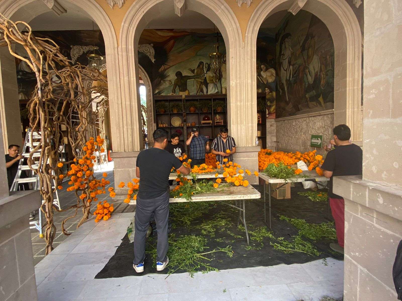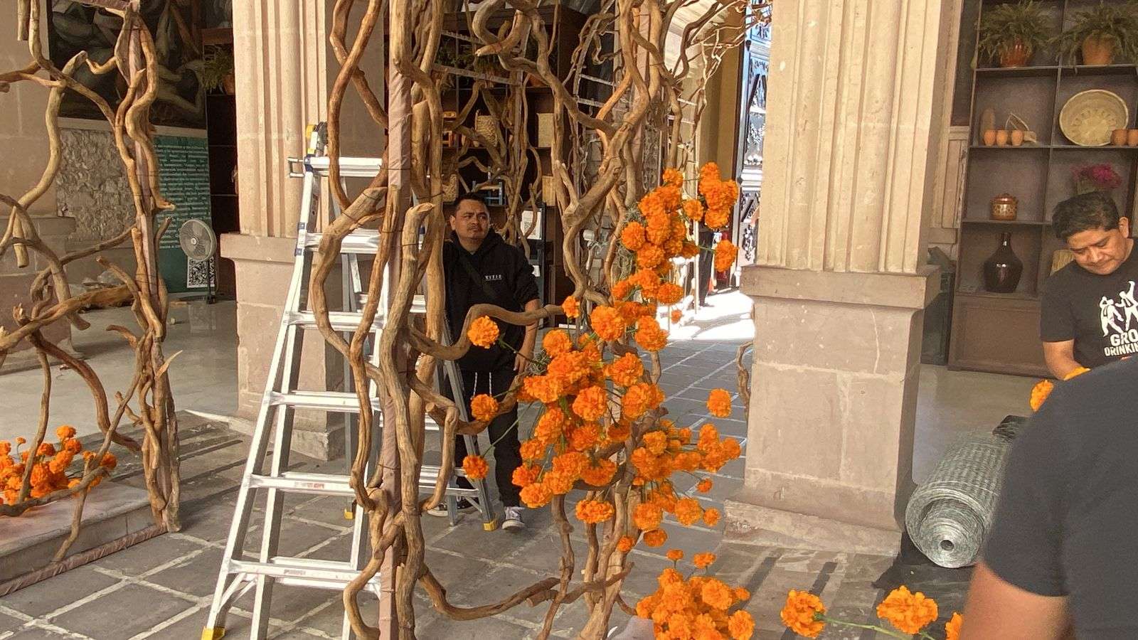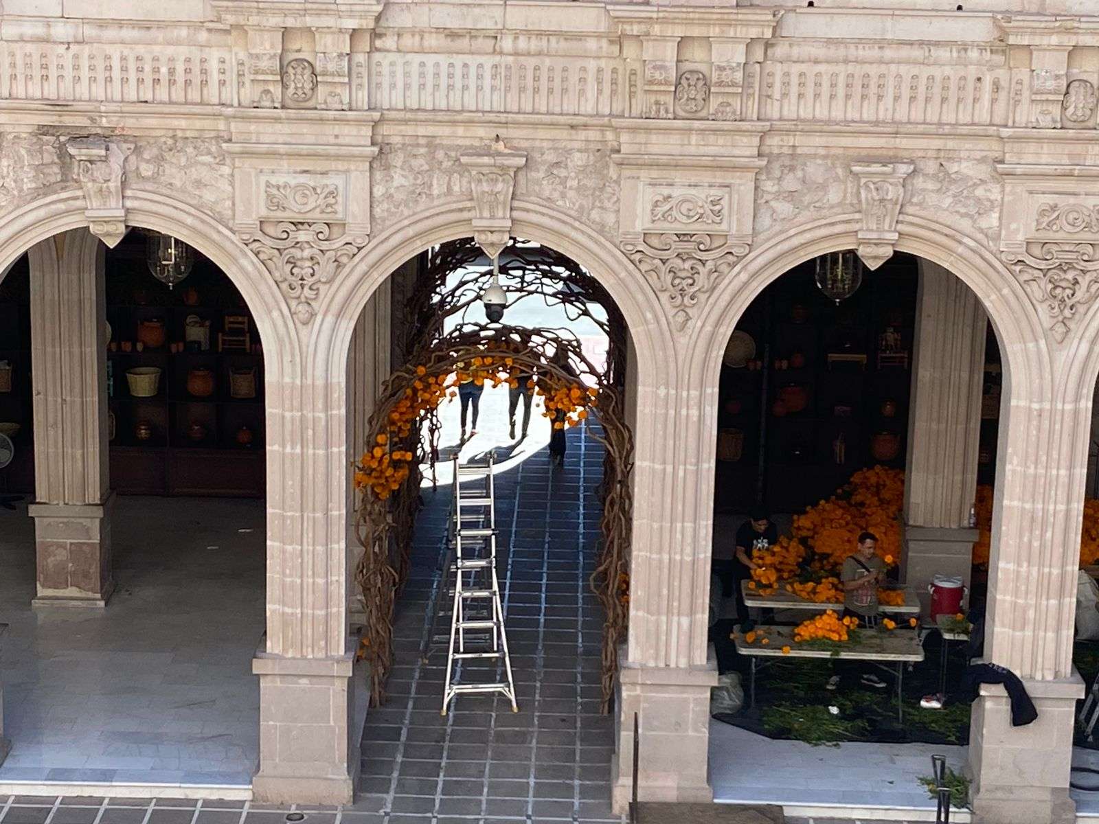 En la entrada del Palacio de Gobierno, están colocando arcos de acero cubiertos de raíces, que a su vez serán forrados con flores de cempasúchil.