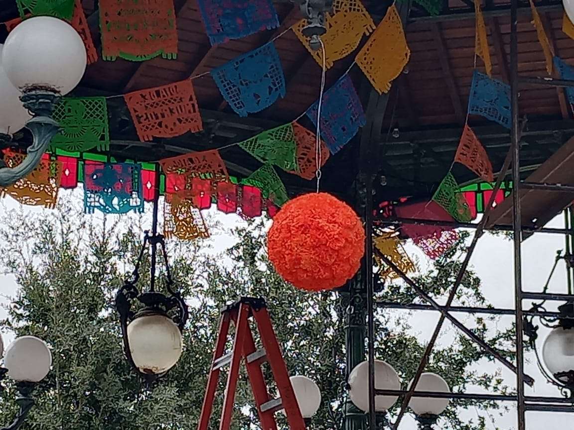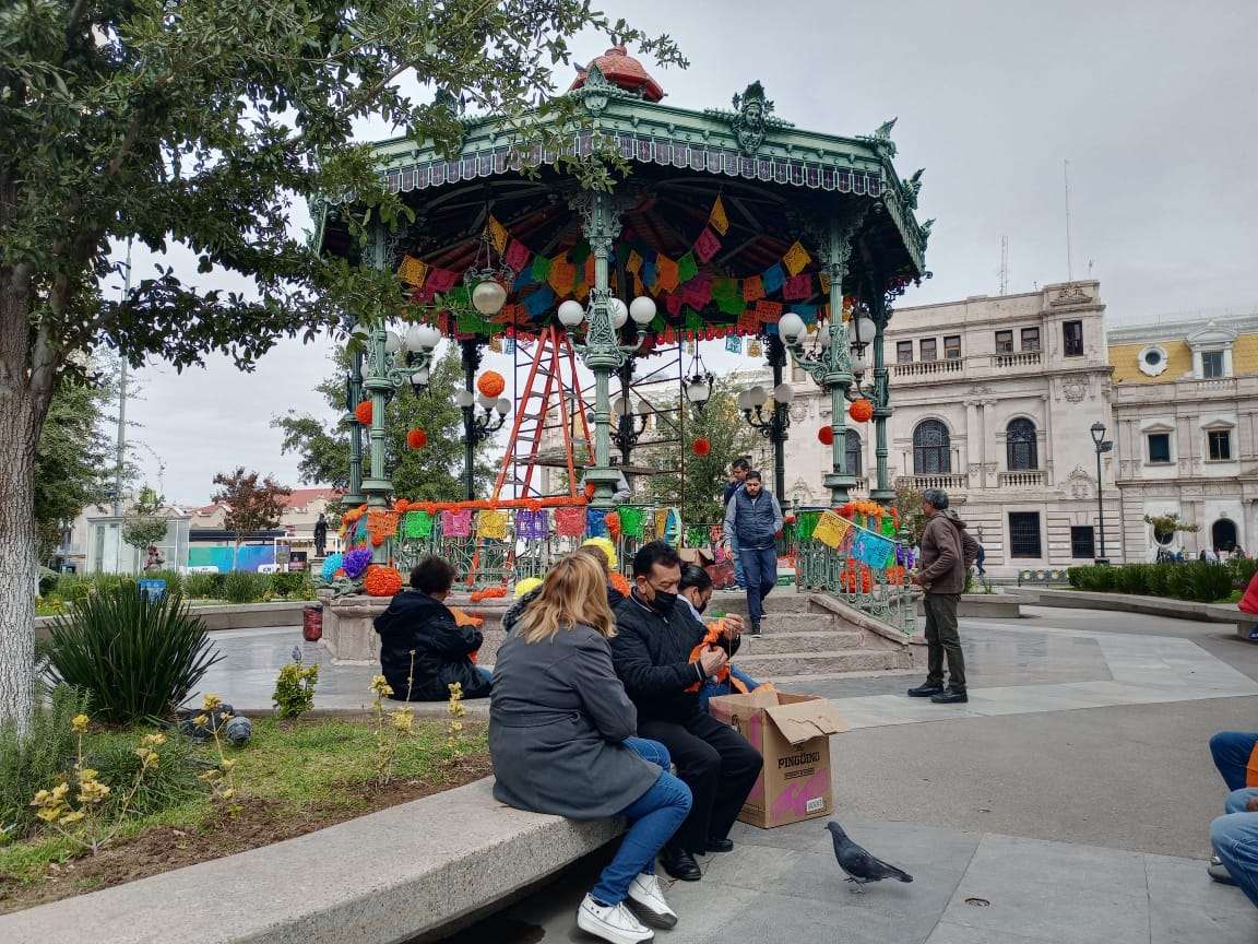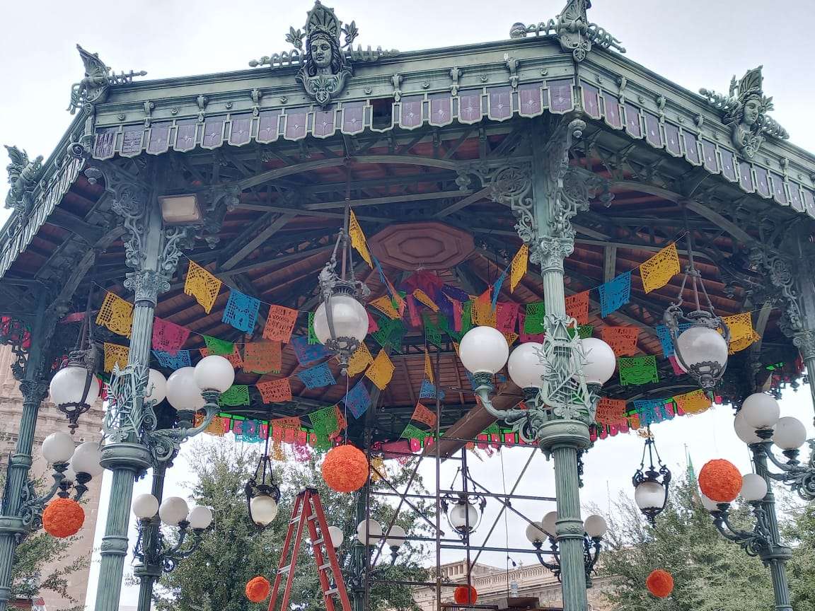 Adornos como las típicas calaveras, la mística flore de cempasúchil, papel picado, velas y luces de colores es lo que sobresale para darle magia al Kiosco de la Plaza de Armas.