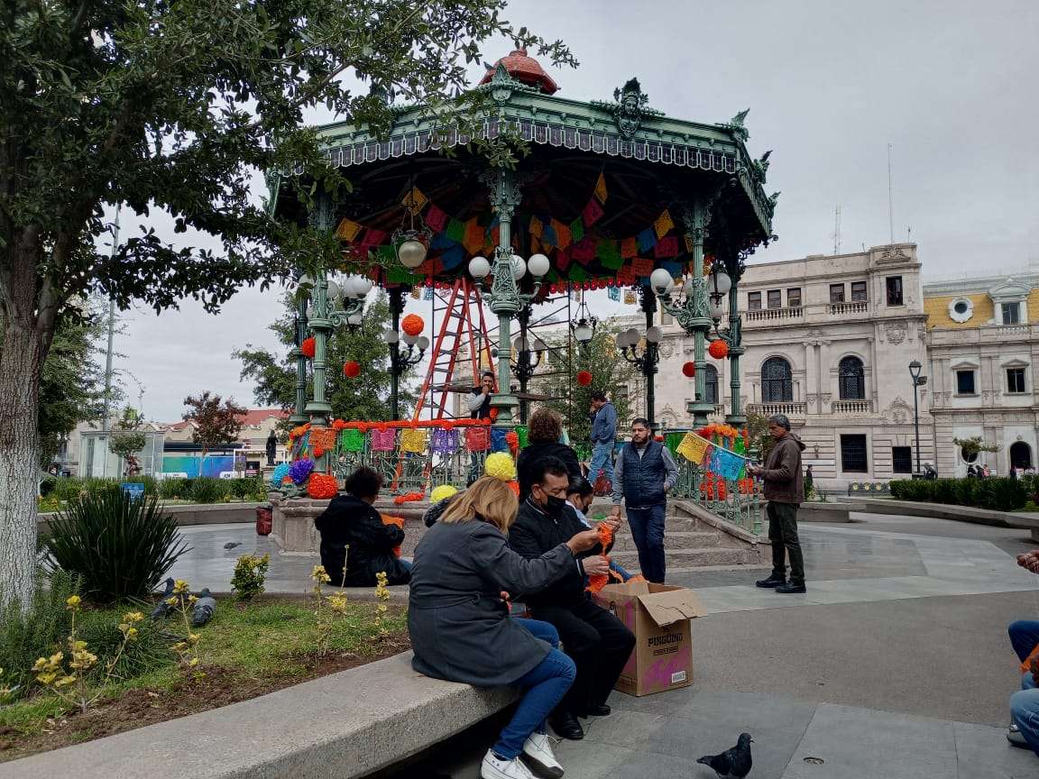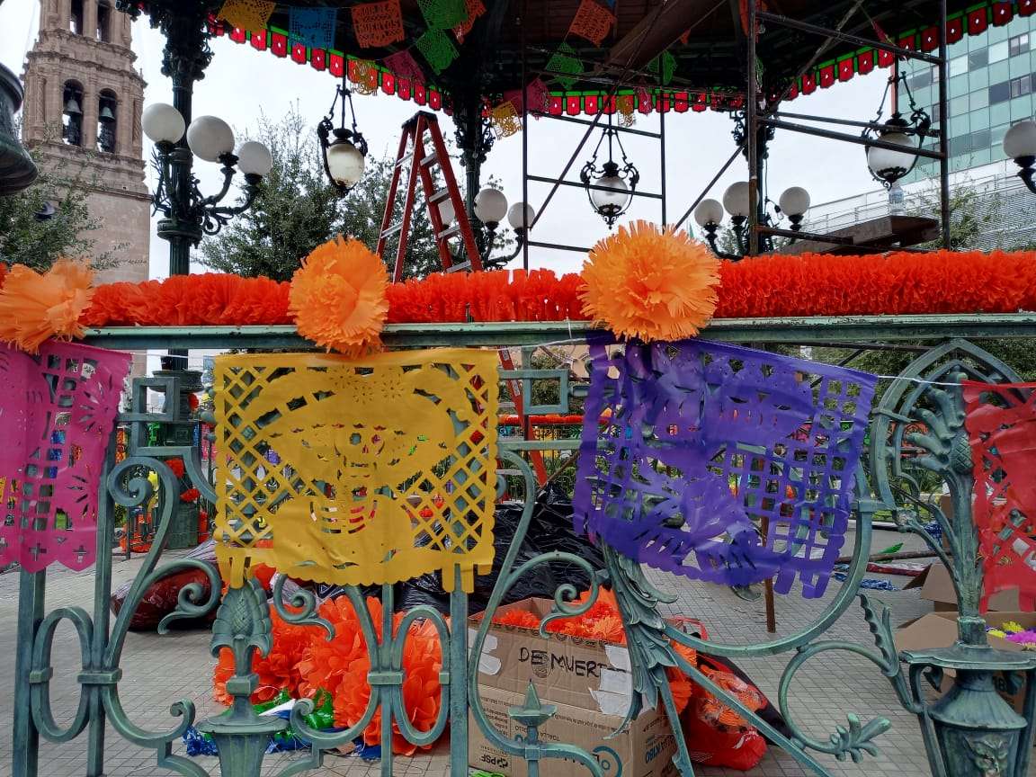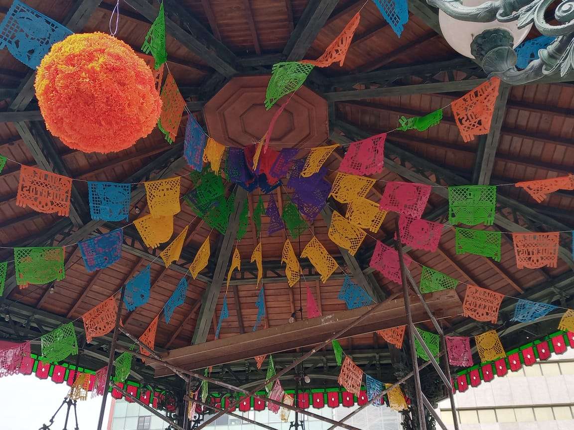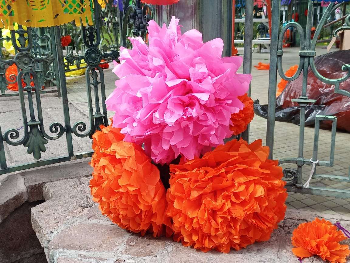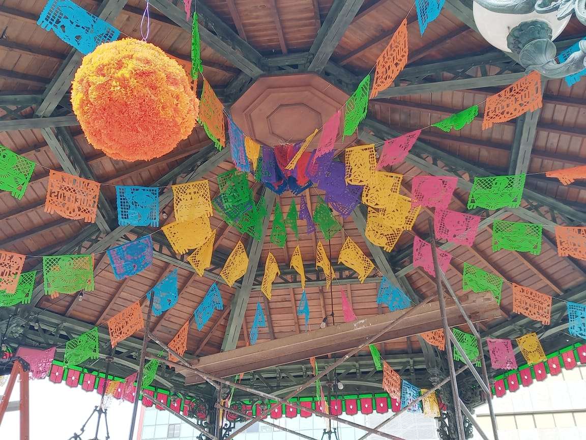 El Kiosco ubicado en el centro de la plaza, fue decorado con papel picado en forma de flor de cempasuchil y flores de colores, mientras en la entrada de la Catedral se instalaron un altar de muertos .