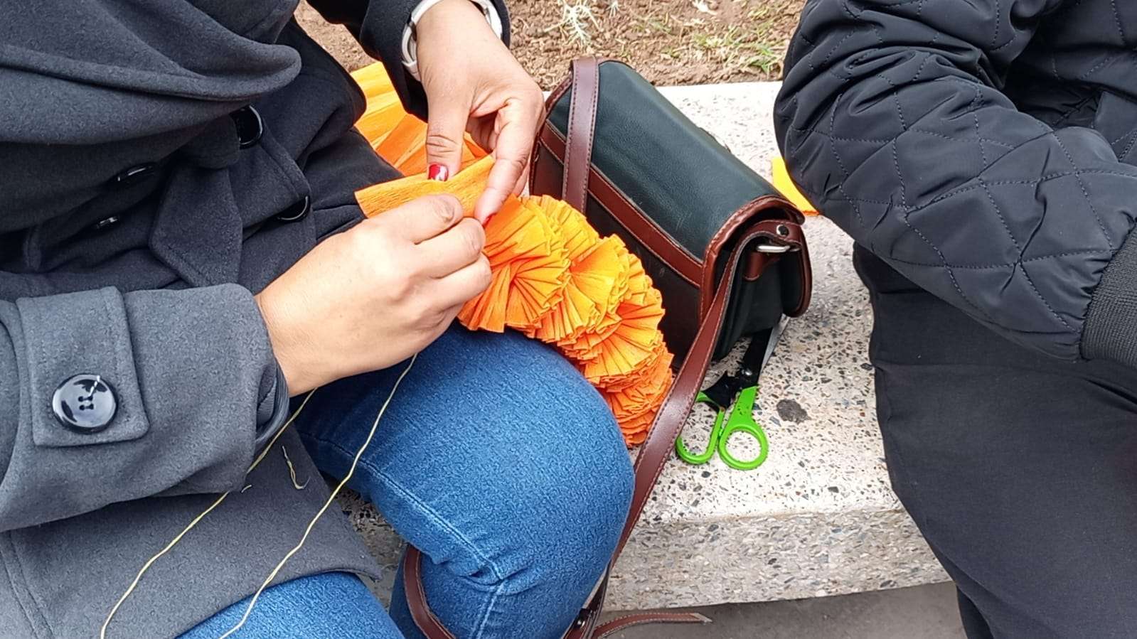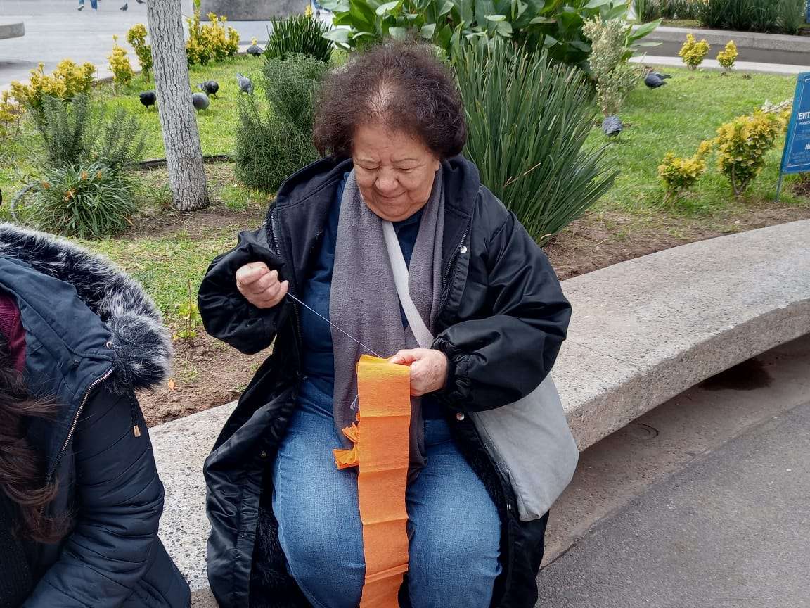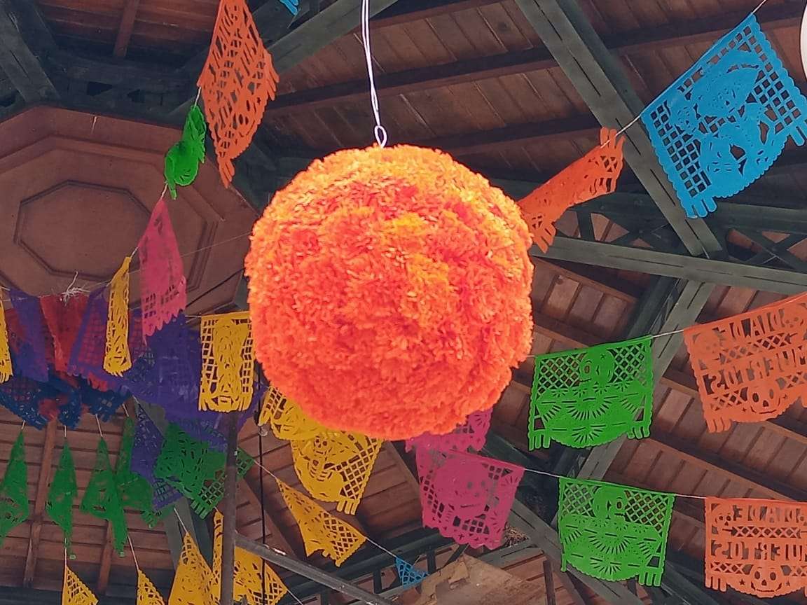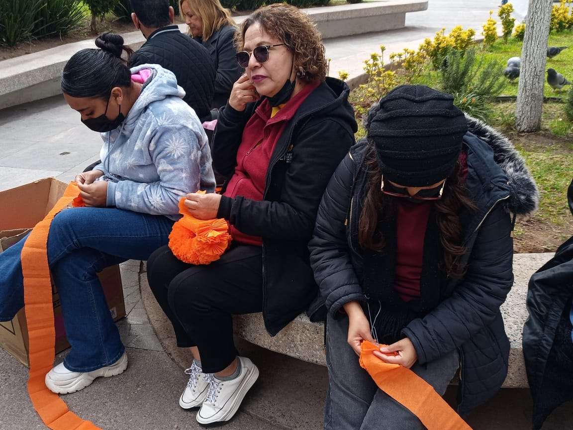 El Kiosco ubicado en el centro de la plaza, fue decorado con papel picado en forma de flor de cempasuchil y flores de colores, mientras en la entrada de la Catedral se instalaron un altar de muertos .