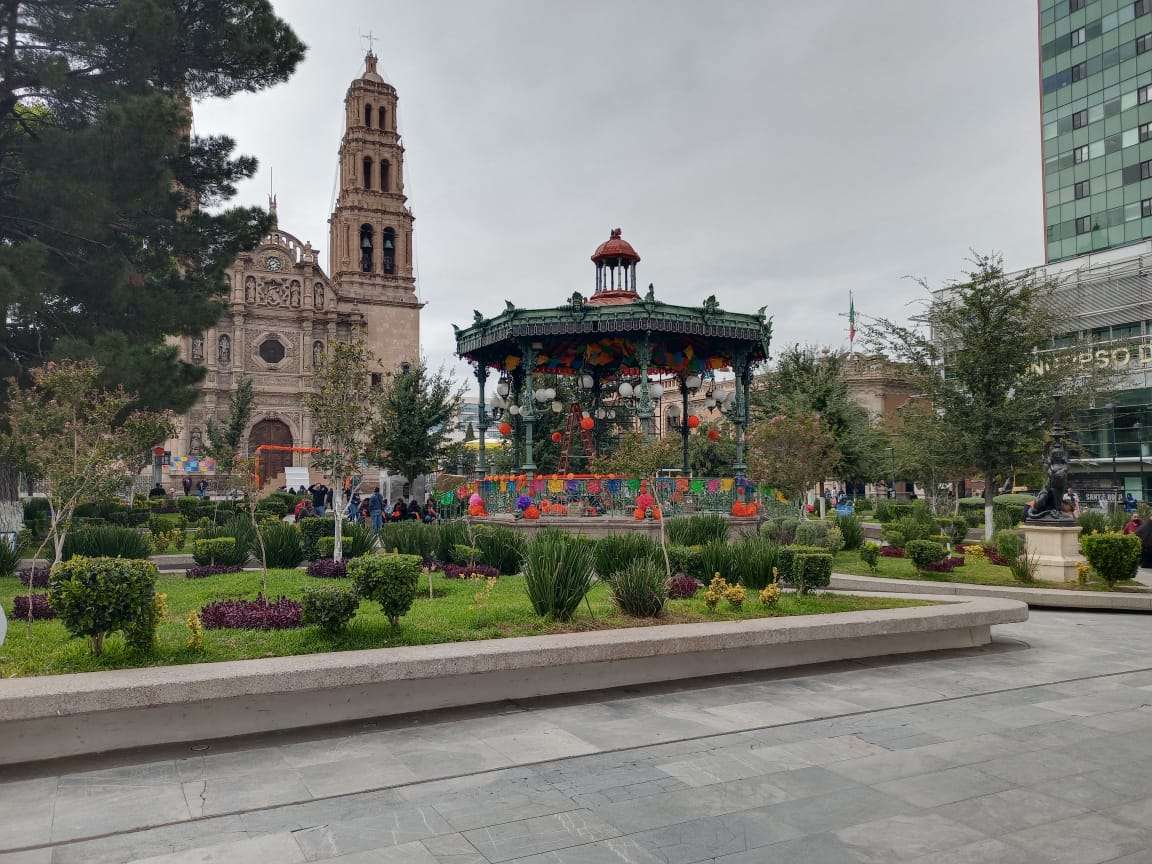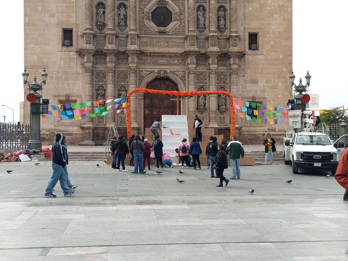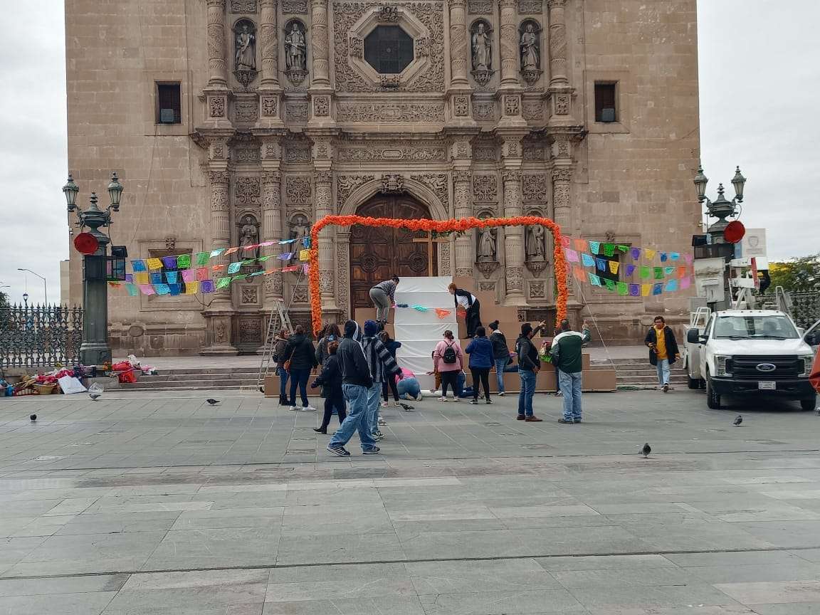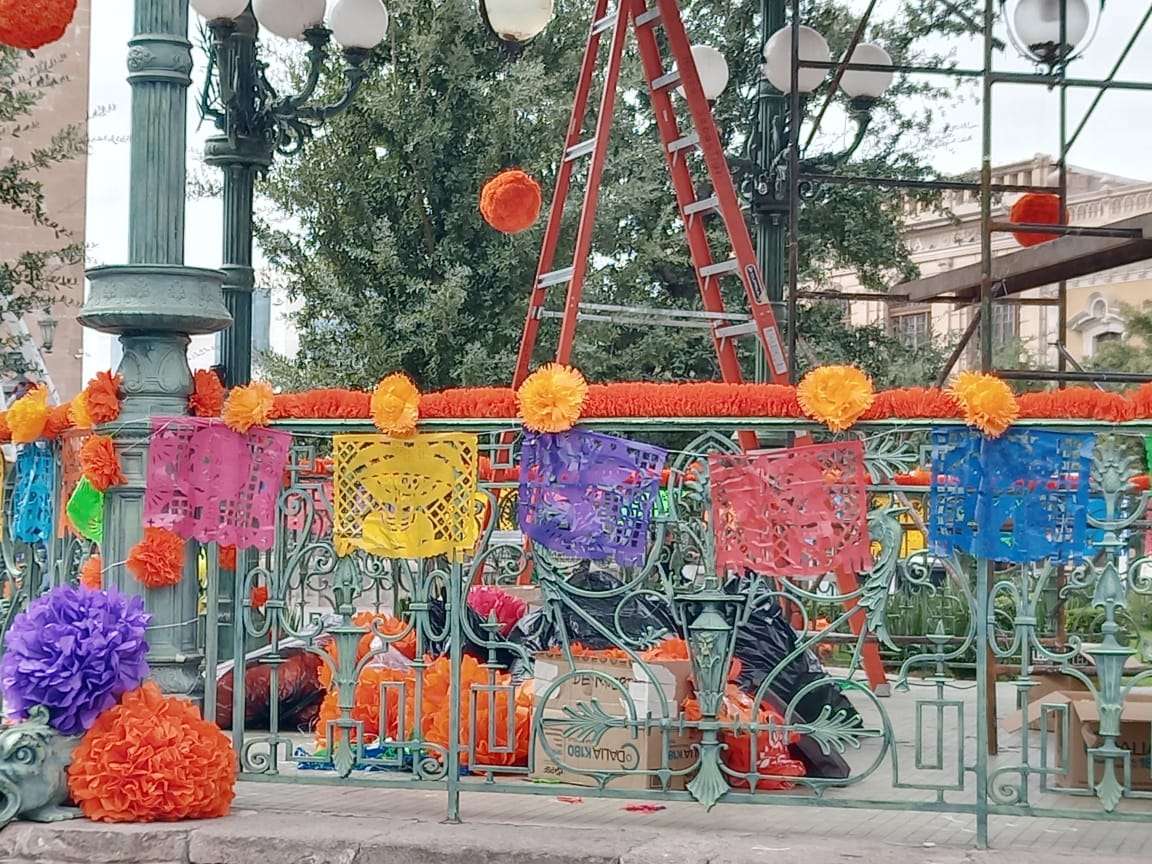 Chihuahua.- Comenzaron a realizar arreglos en la Plaza de Armas ubicada en el centro de la ciudad con motivo del tradicional festejo de Día de Muertos.