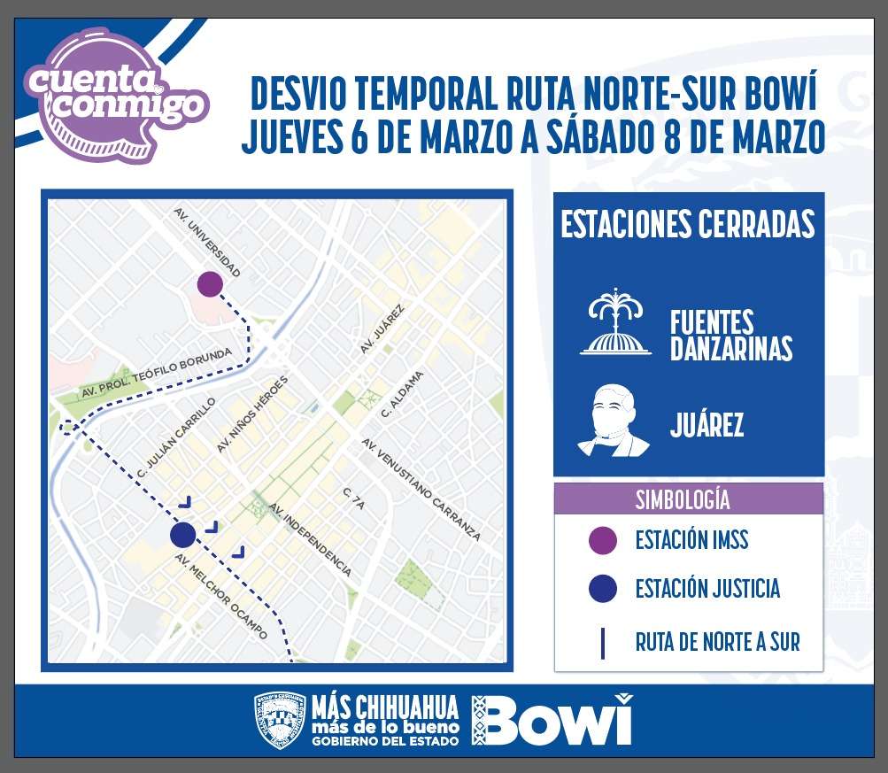 Chihuahua.- La Secretaría General de Gobierno, a través de la Operadora de Transporte (OTV), informa que las estaciones Fuentes Danzarinas y Juárez del Bowí permanecerán cerradas del jueves 6 de marzo al sábado 8 de marzo, debido al cierre de la avenida Juárez en el centro de la ciudad.
