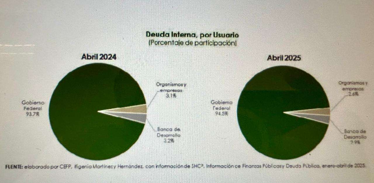 Dentro de la deuda interna, que totalizó 13 billones 984 mil 571.8 millones de pesos, se observa un incremento del 9.3% respecto a abril de 2024.