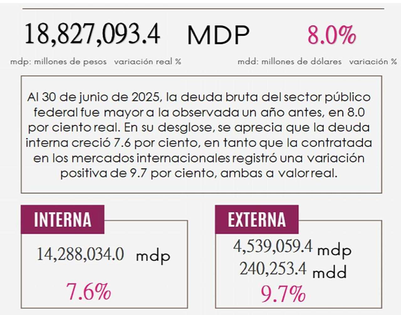 Según se dió a conocer, al cierre de abril del 2025, el saldo de la deuda bruta del Sector Público Federal se ubicó en 18 billones 669 mil 252.7 millones de pesos, cifra que representa un crecimiento real del 11.6% en comparación con el mismo periodo del año anterior y la mayor parte de la deuda, el 74.9%, se ha contratado en el mercado interno, mientras que el 25.1% restante corresponde a deuda externa.