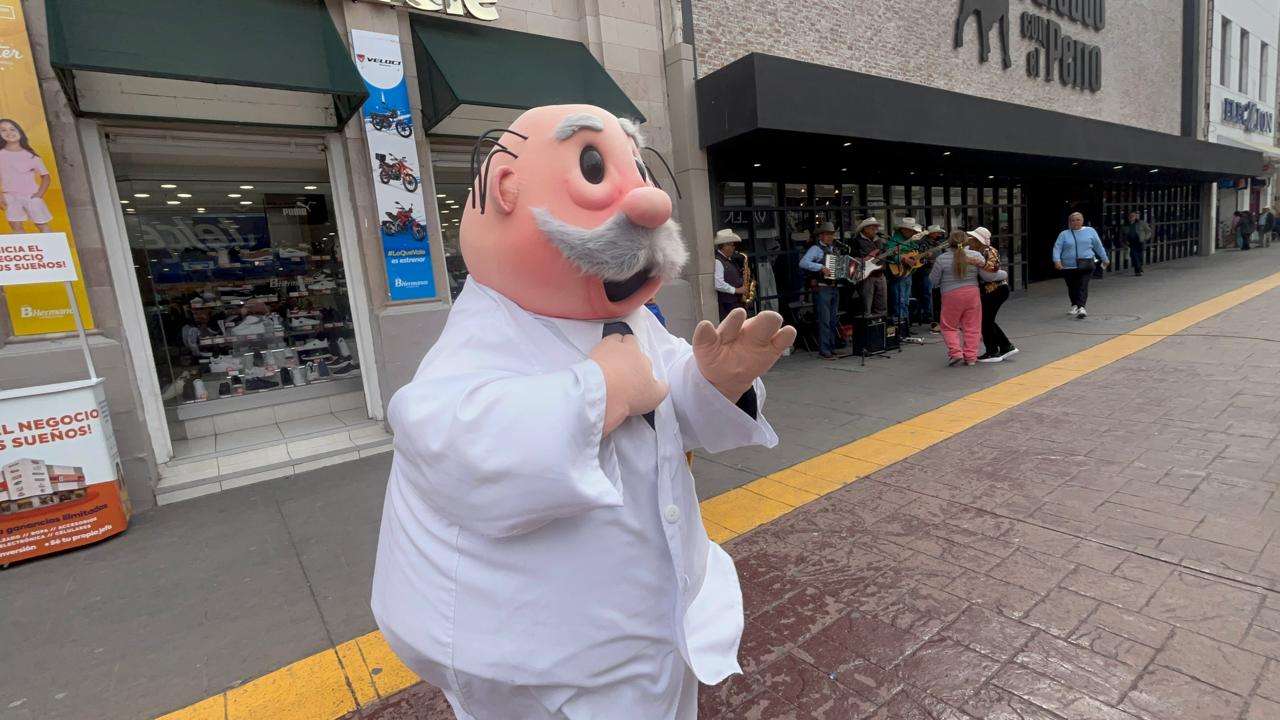 El encuentro ocurrió cuando la agrupación musical comenzó a interpretar una de sus melodías movidas frente a los transeúntes, pero sin previo aviso, y motivado por el ritmo, el icónico médico de peluche abandonó su puesto en la entrada de la farmacia para presumir sus mejores pasos.