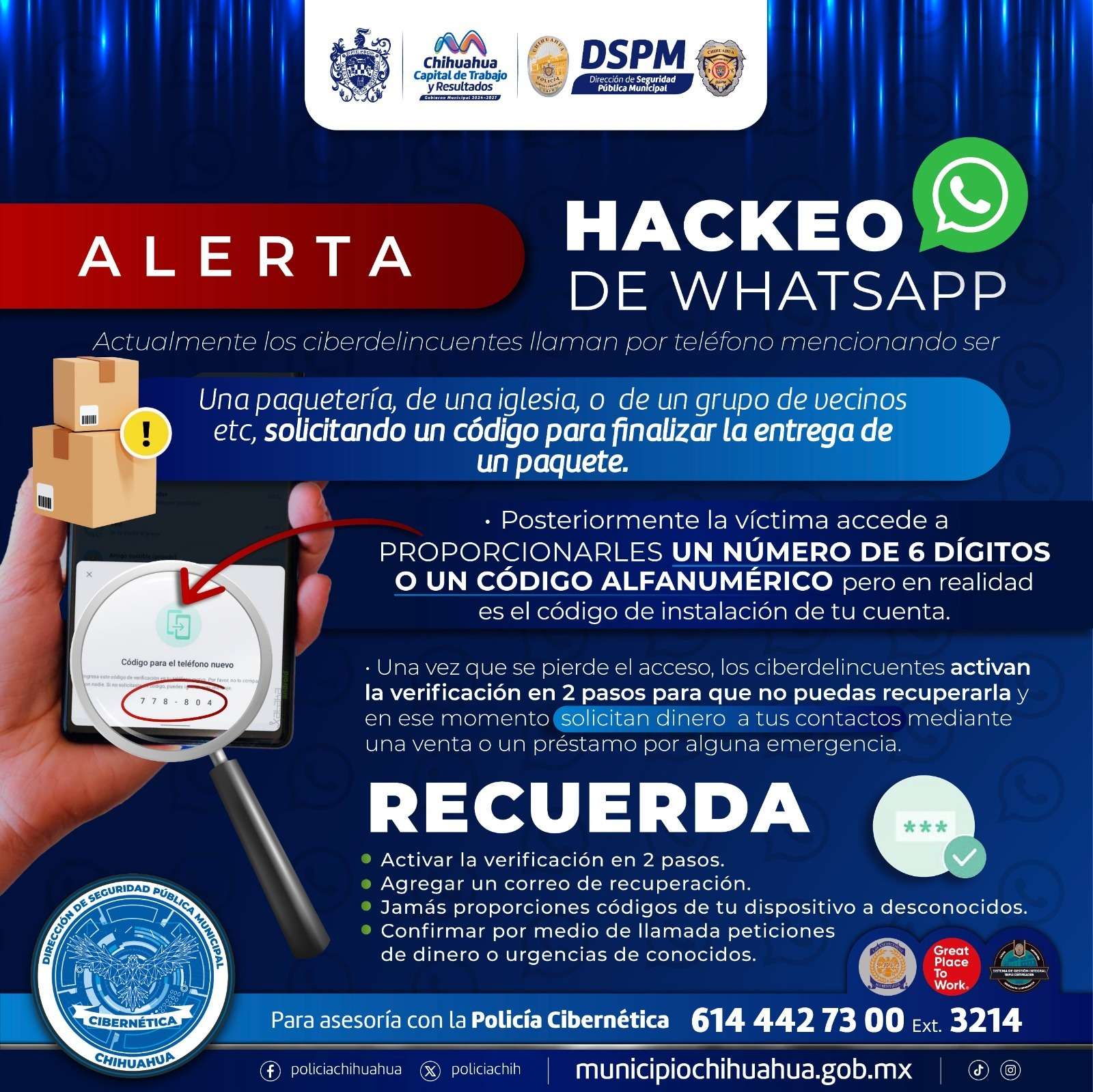 Si tienen dudas o necesitas orientación, comunícate al teléfono de la Policía Cibernética 614-442-73-00 ext. 3214, o acude directamente a la Comandancia Norte, en la avenida Homero. Ante cualquier emergencia, marca a la línea 9-1-1.