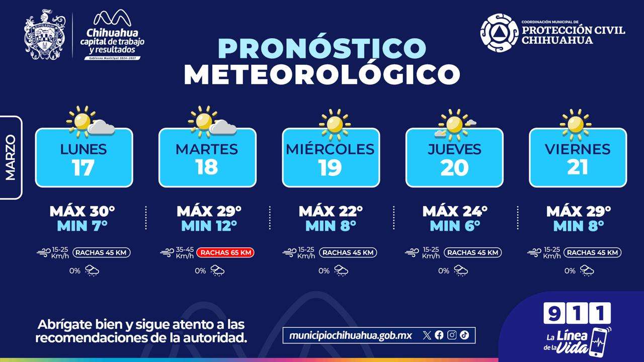Chihuahua.- La Coordinación de Protección Civil Municipal, informa que para esta semana se pronostican temperaturas máximas de 30°C con mínimas de 6°C, así como presencia de rachas de viento de hasta 65 kilómetros por hora, especialmente el martes.