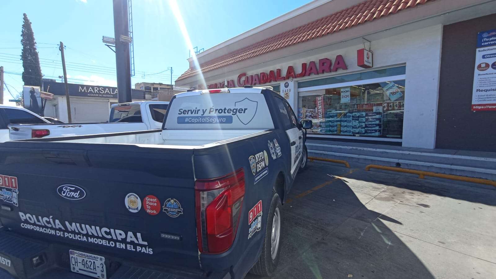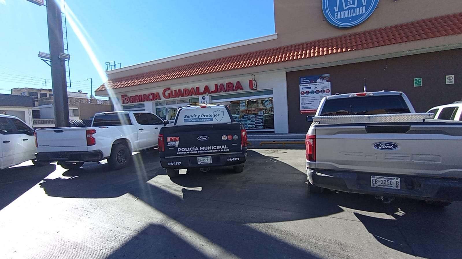 Chihuahua, Chih.- Dos sujetos asaltan una sucursal de Farmacias Guadalajara ubicada sobre la avenida Pacheco, en el cruce con Coronado, donde amagaron a la cajera con un cuchillo para exigir el dinero de la caja registradora.