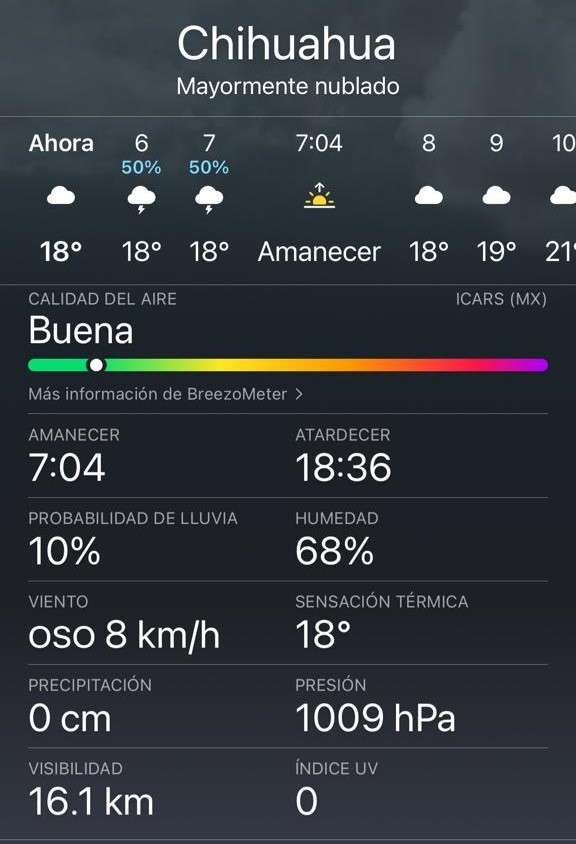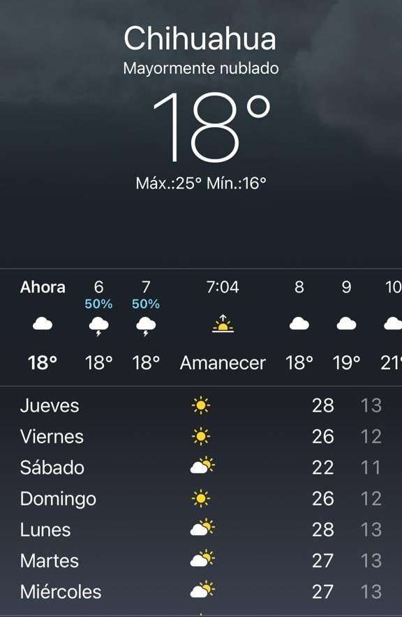 Chihuahua.- Al inicio del día estará por la mañana con un cielo nublado de las 06:00 a las 13:00 horas, con probabilidad de lluvias ligeras de un 10% entre las 06:00 y las 08:00 horas.