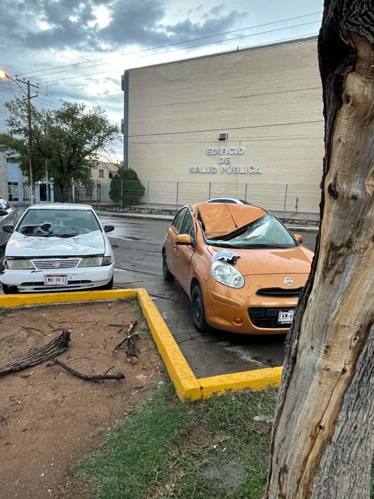 Chihuahua. – Las láminas que salieron volando del techo del Hospital Central fueron las causantes del daño en al menos dos vehículos; uno de ellos fue un march color cobre y el otro un sentra color blanco, mismos que se encontraban estacionados.