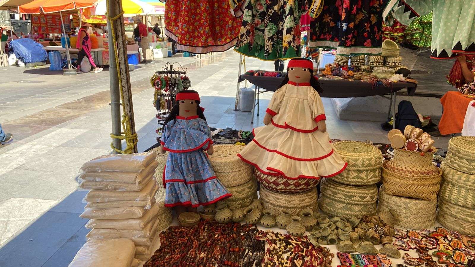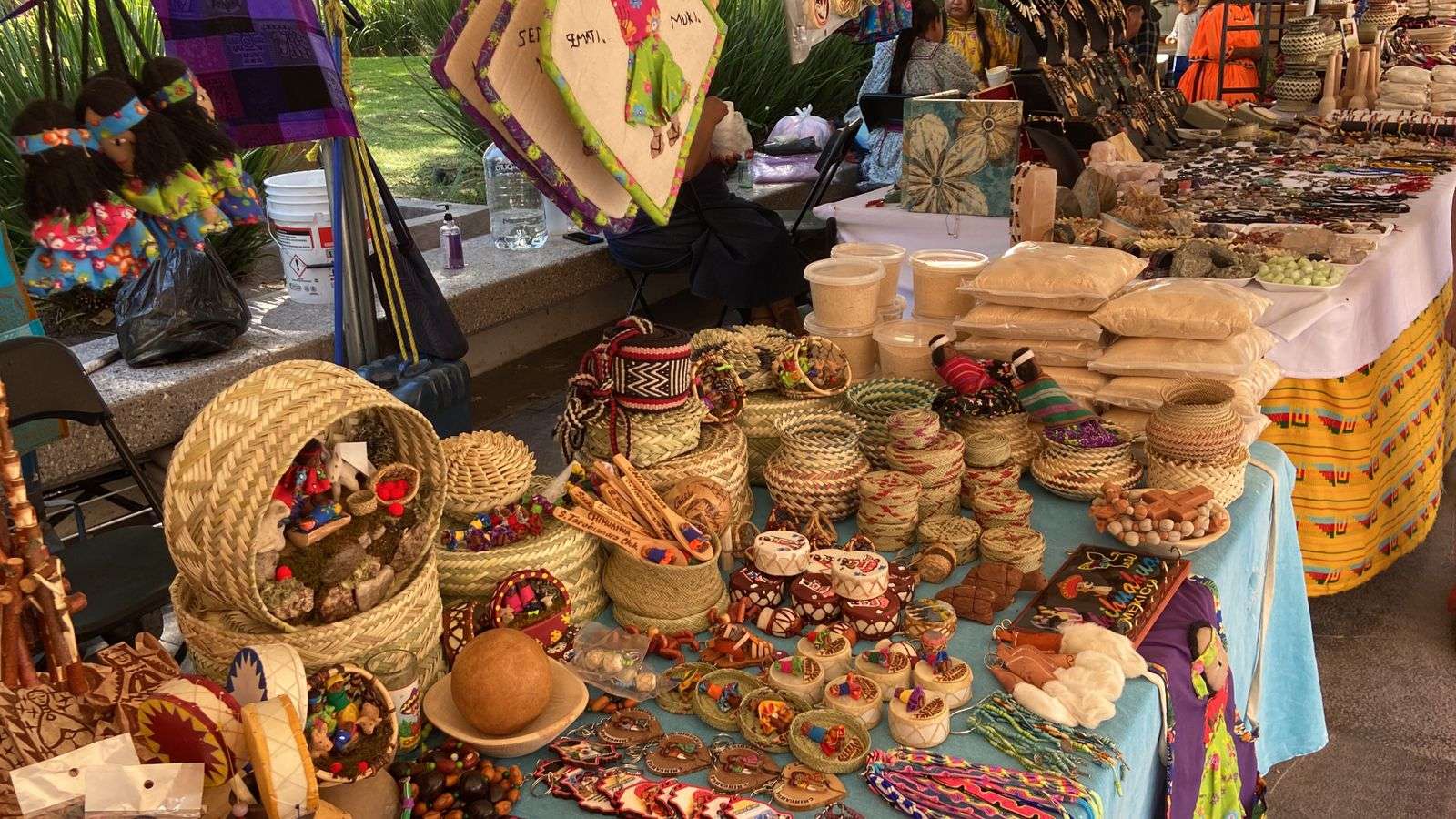 Los artesanos tienen una gran variedad de objetos elaborados a mano, ropa tradicional, joyería, pinole, pulseras, así como la tradicional comida gorditas, burritos, quesadillas y aguas frescas.