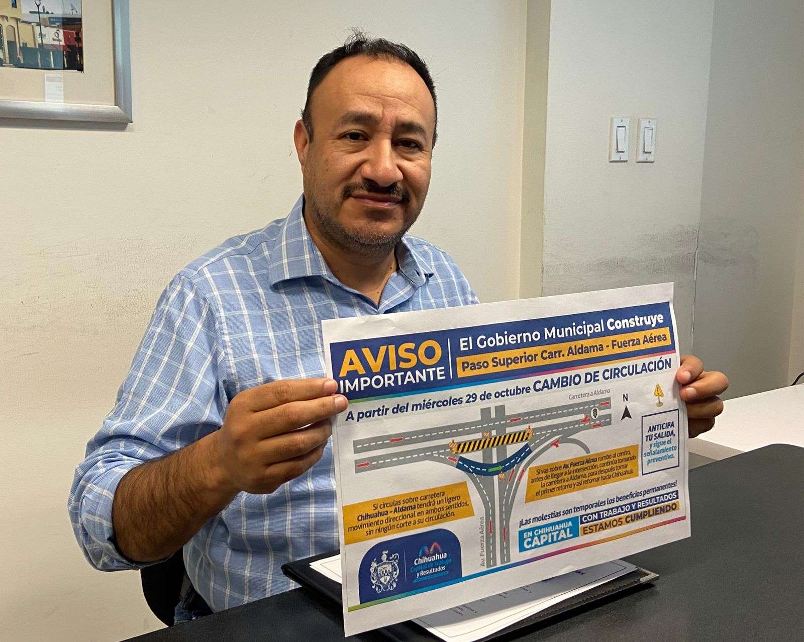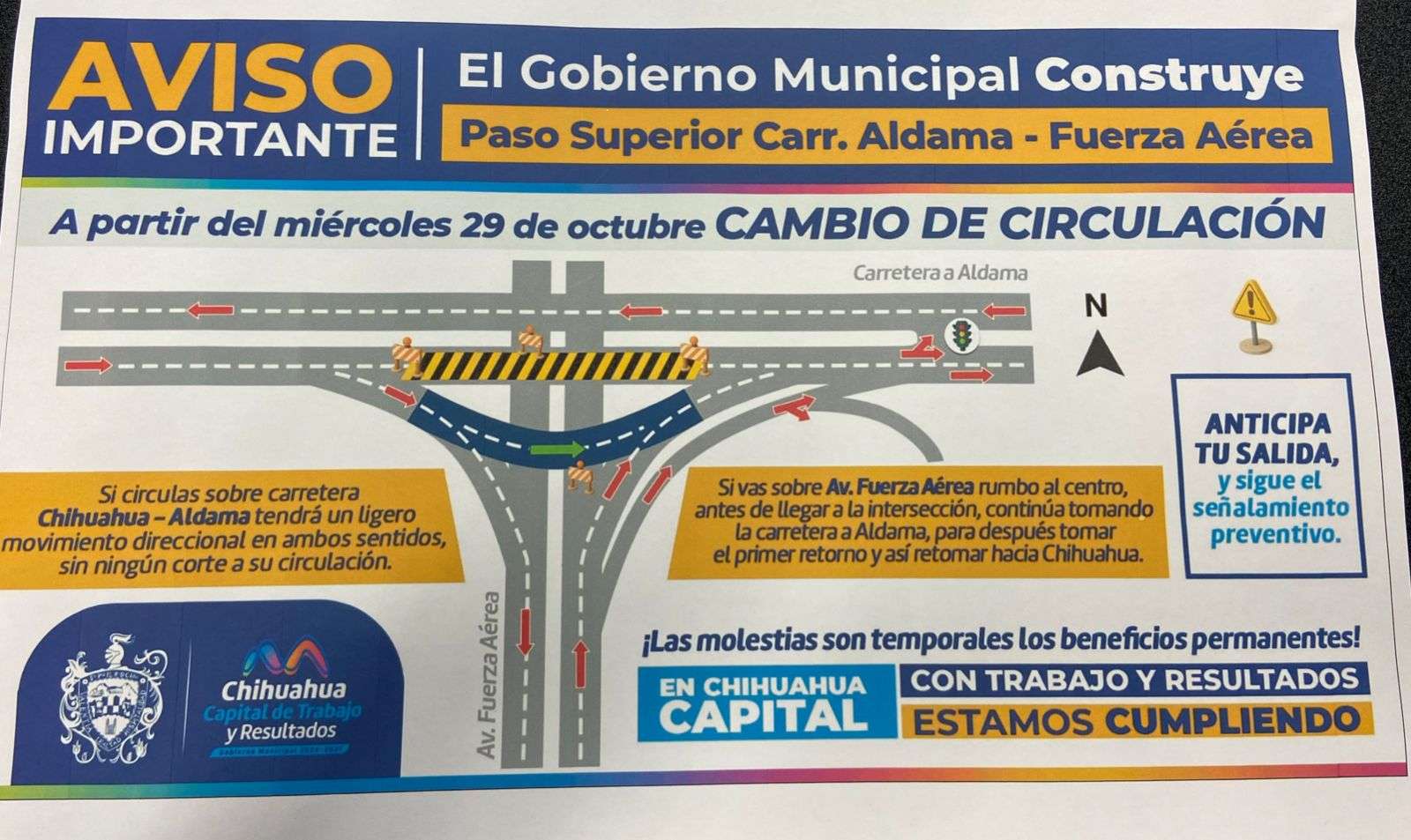 Chihuahua.- El Director de Obras Públicas Carlos Rivas, señaló que a partir del próximo 29 de octubre se realizará el desvíos de la circulación de la carretera a Aldama y de la Fuerza Aérea Mexicana por el inicio de la construcción del paso superior.