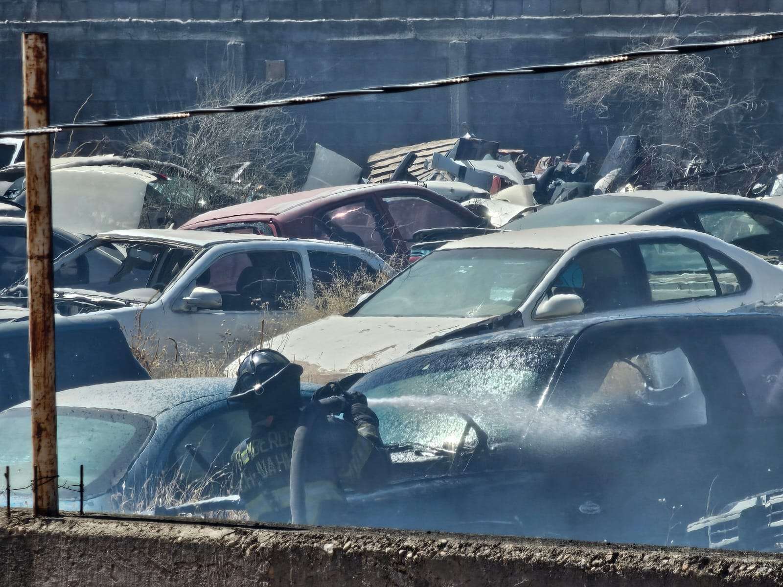 Chihuahua.- Un incendio provocado por la quema de hierba seca se salió de control y consumió un total de 22 vehículos en desuso que se encontraban al interior de un predio utilizado como yonke.
