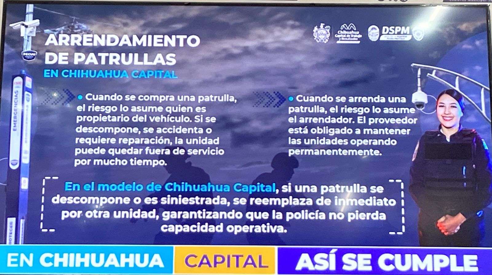 Además, señaló que cuando una patrulla se siniestra o se descompone la arrendadora la reemplaza inmediatamente, garantizando que no se pierda la capacidad operativa por parte de las autoridades.