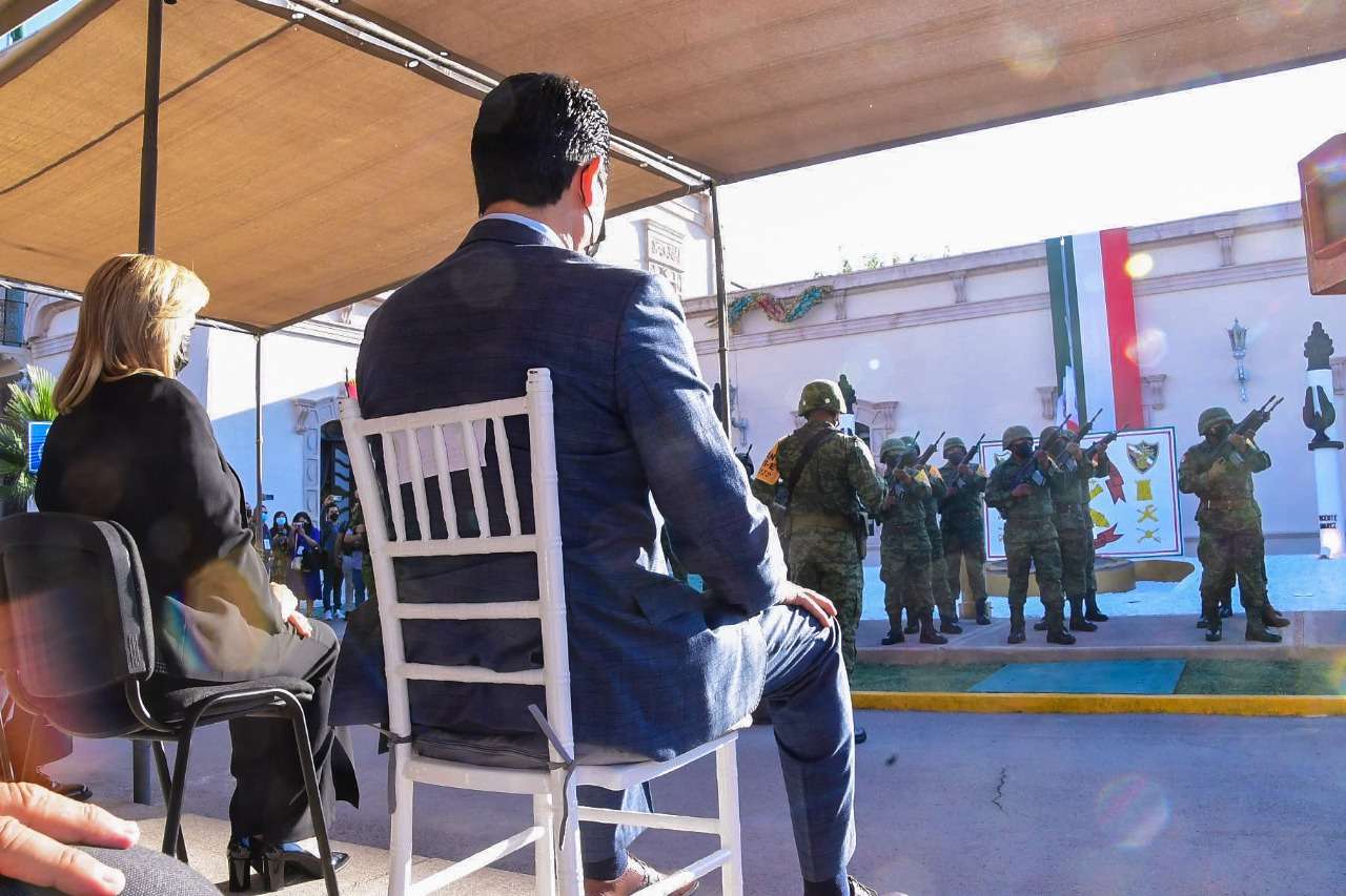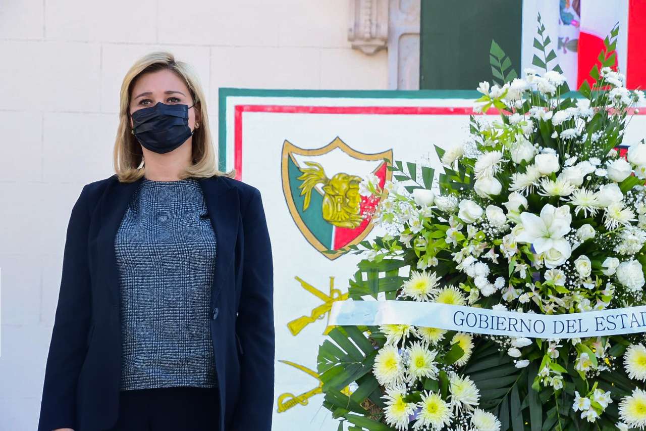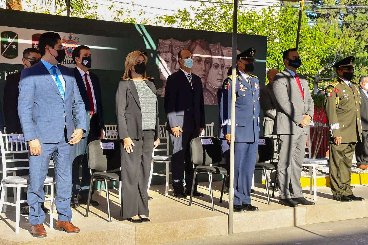 Chihuahua.- En el marco del 174 Aniversario de la Gesta Heroica de los Niños Héroes de Chapultepec, la gobernadora Maru Campos Galván y el General Federico Eduardo Solórzano Barragán, comandante de la 5/a. Zona Militar, acompañados por autoridades civiles y militares, rindieron guardia de honor y colocaron una ofrenda floral.