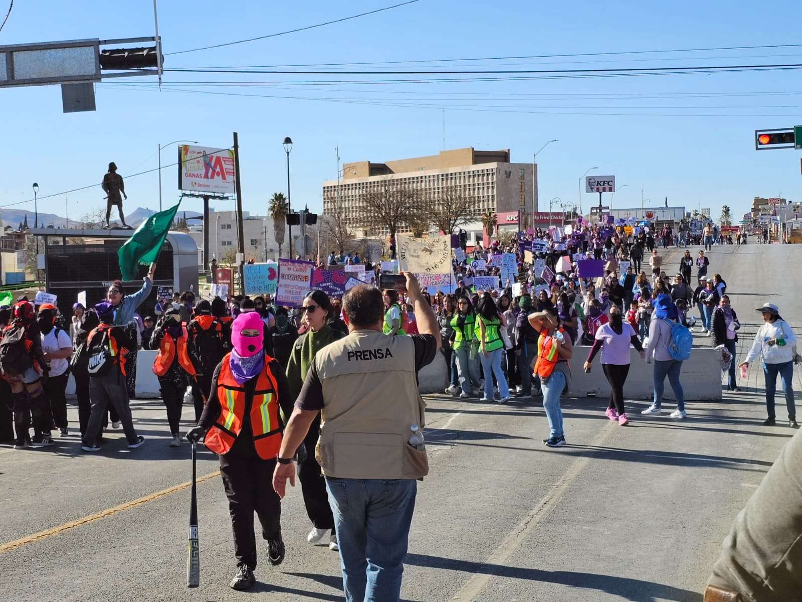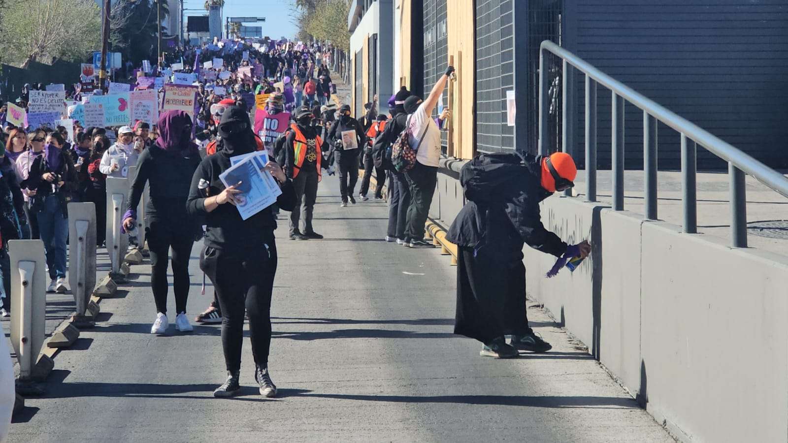 Chihuahua.- Un grupo de aproximadamente 15 mujeres, conocido como el bloque negro, causó varios destrozos en avance de la marcha por el 8M en la ciudad.