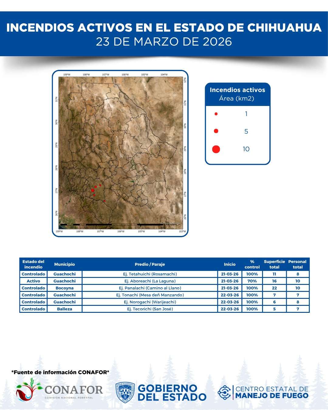 Chihuahua.- La Secretaría de Desarrollo Rural (SDR) informó que 50 combatientes atienden seis incendios forestales en los municipios de Guachochi, Bocoyna y Balleza, los cuales ya se encuentran controlados y se espera su liquidación en las próximas horas.