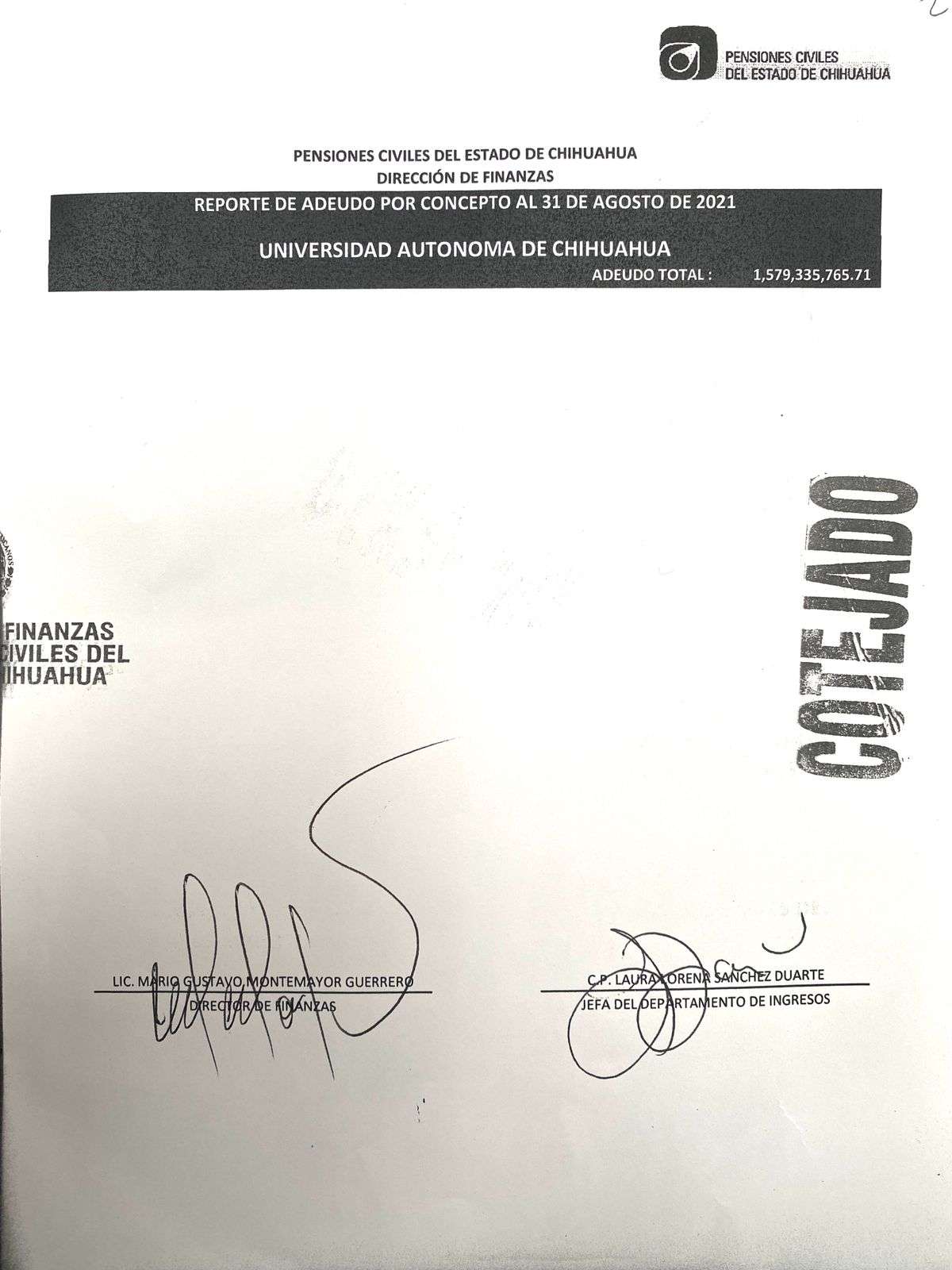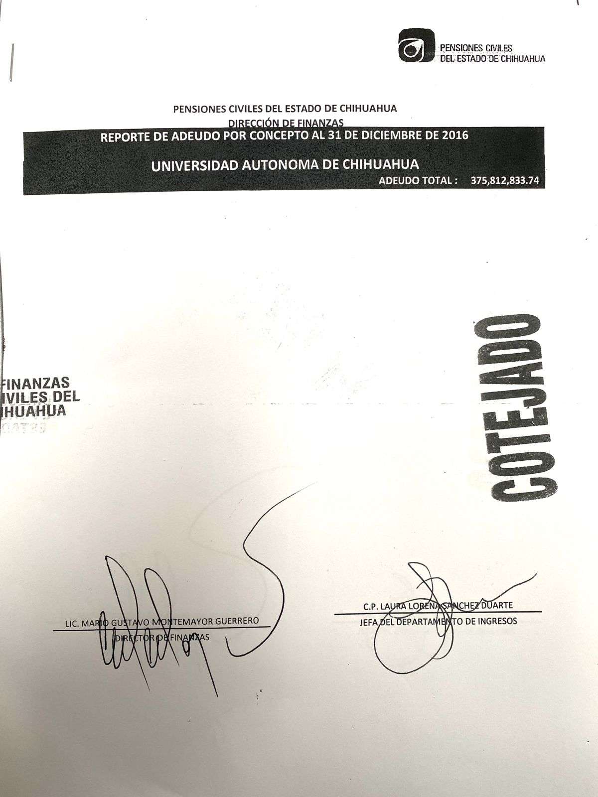 La Dirección de Finanzas de Pensiones Civiles, informó mediante una solicitud de transparencia que, el adeudo de la UACH al instituto en diciembre del 2016 alcanzaba apenas los $375 millones 812 mil 833 pesos.