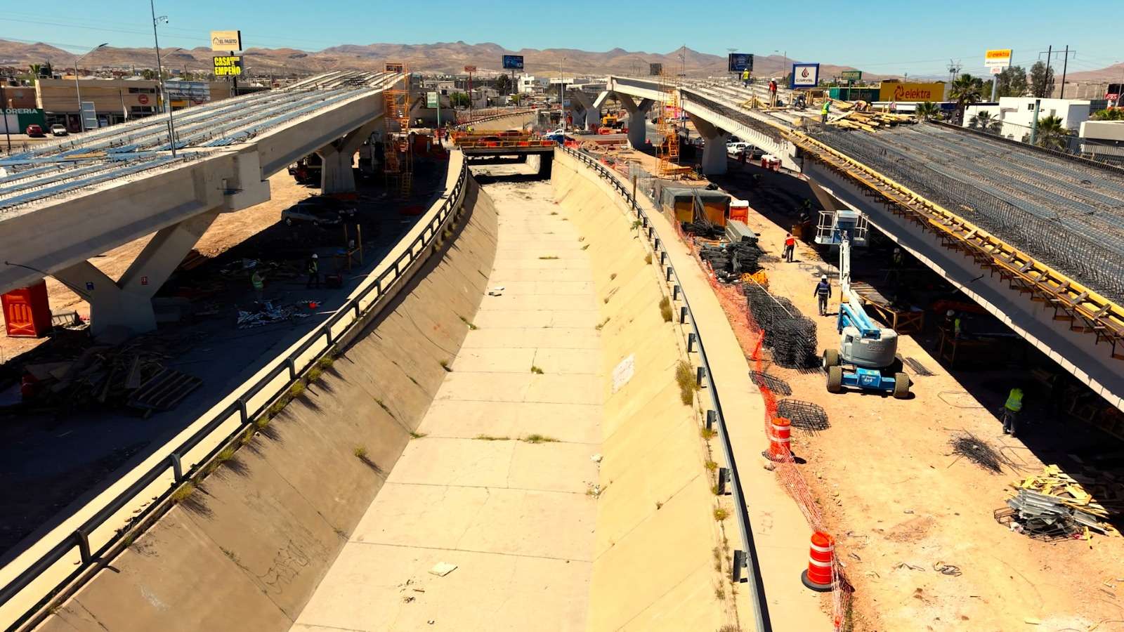 Chihuahua. - La Dirección de Obras Públicas del Gobierno Municipal, avanza en la construcción del paso superior de la vialidad Los Nogales y avenida de las Industrias, obra estratégica que beneficiará directamente a más de 350 mil habitantes y que ayudará a resolver la carga vehicular en esta zona al norte de la ciudad.