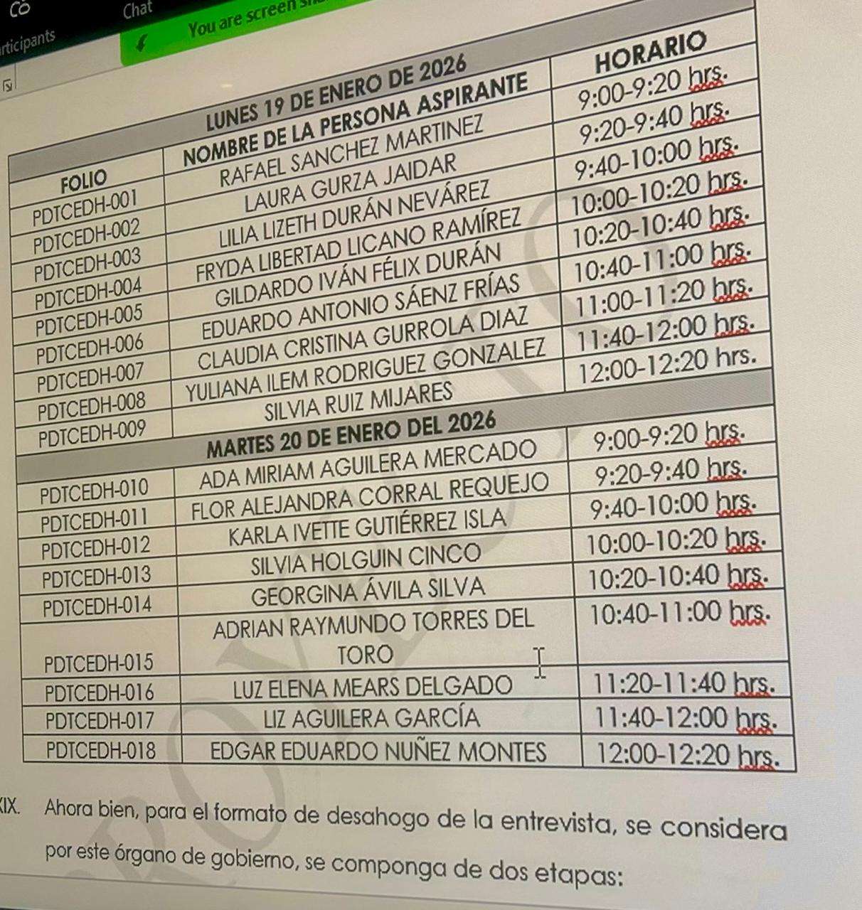 Chihuahua.- Durante la sesión de la Junta de Coordinación Política (JUCOPO) del Congreso del Estado, se dio a conocer que, tras una revisión exhaustiva de los expedientes, solo 18 de las 23 personas registradas lograron acreditar la totalidad de los requisitos para contender por la presidencia de la Comisión Estatal de los Derechos Humanos (CEDH).